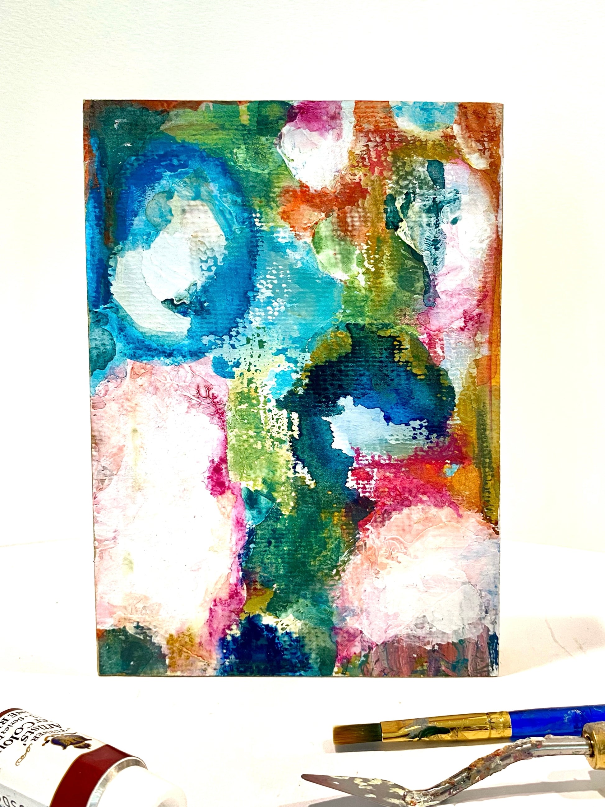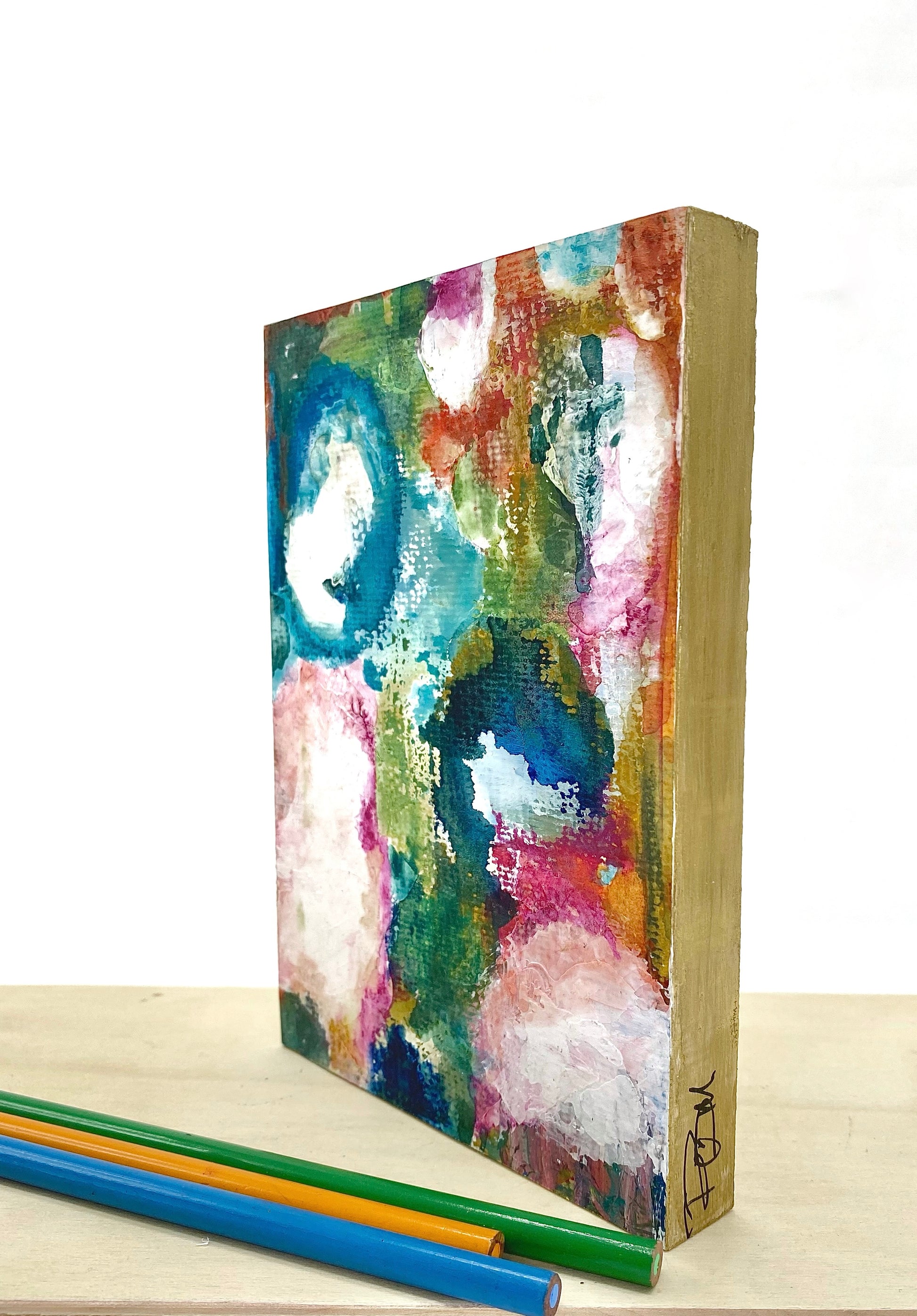 My materials: Caran d’Ache Neocolor ll, concentrated watercolors, acrylic and alcohol ink, acrylic paint, and oil pastels, on 140 lb. cold pressed paper. Mounted on cradled wood panels with gilded muted gold edges. Signed with initials on the side panel and full signature on backs. The finish on these is textural and can look either matte or satin, using archival methods, with the final layer being burnished cold wax.