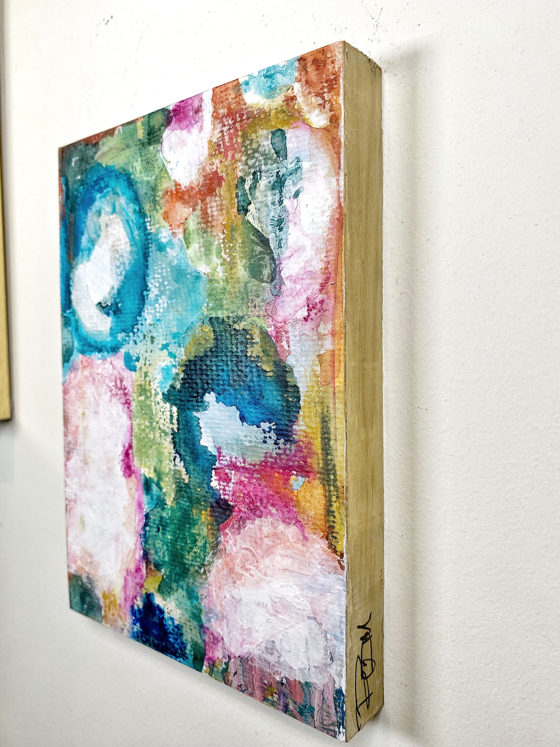 These 5x7 pieces stand on their own, making them a perfect shelf sitter, or can be hung using the cradled wood frame. Some were created as a series of two, three or four, and can be set up that way or individually.