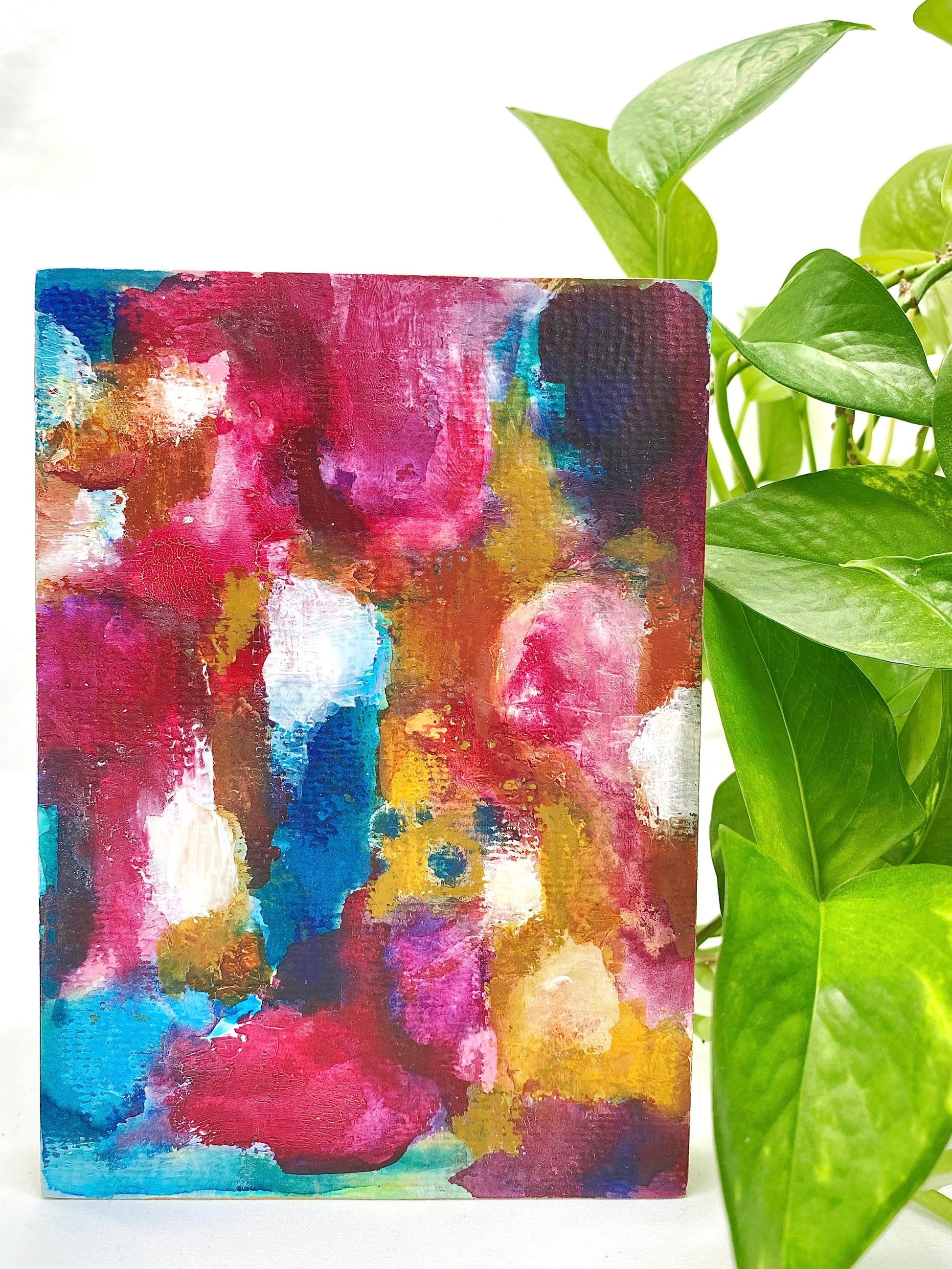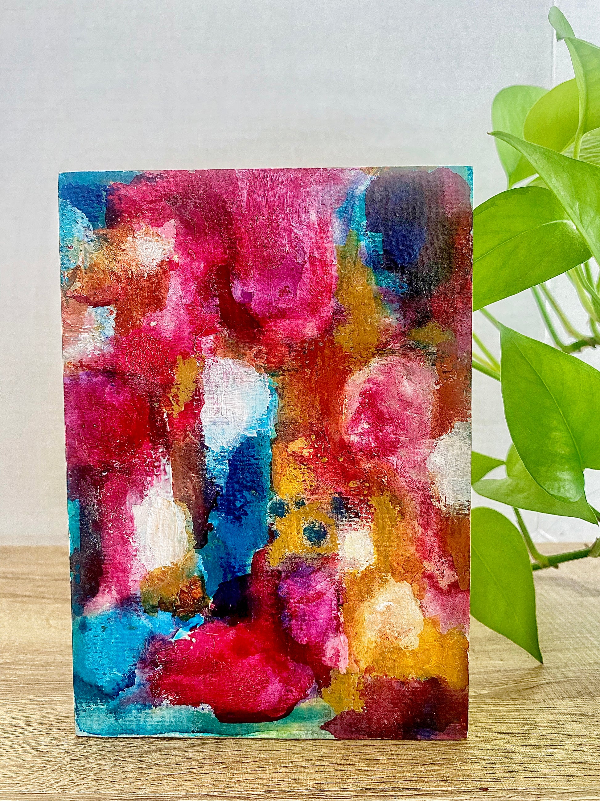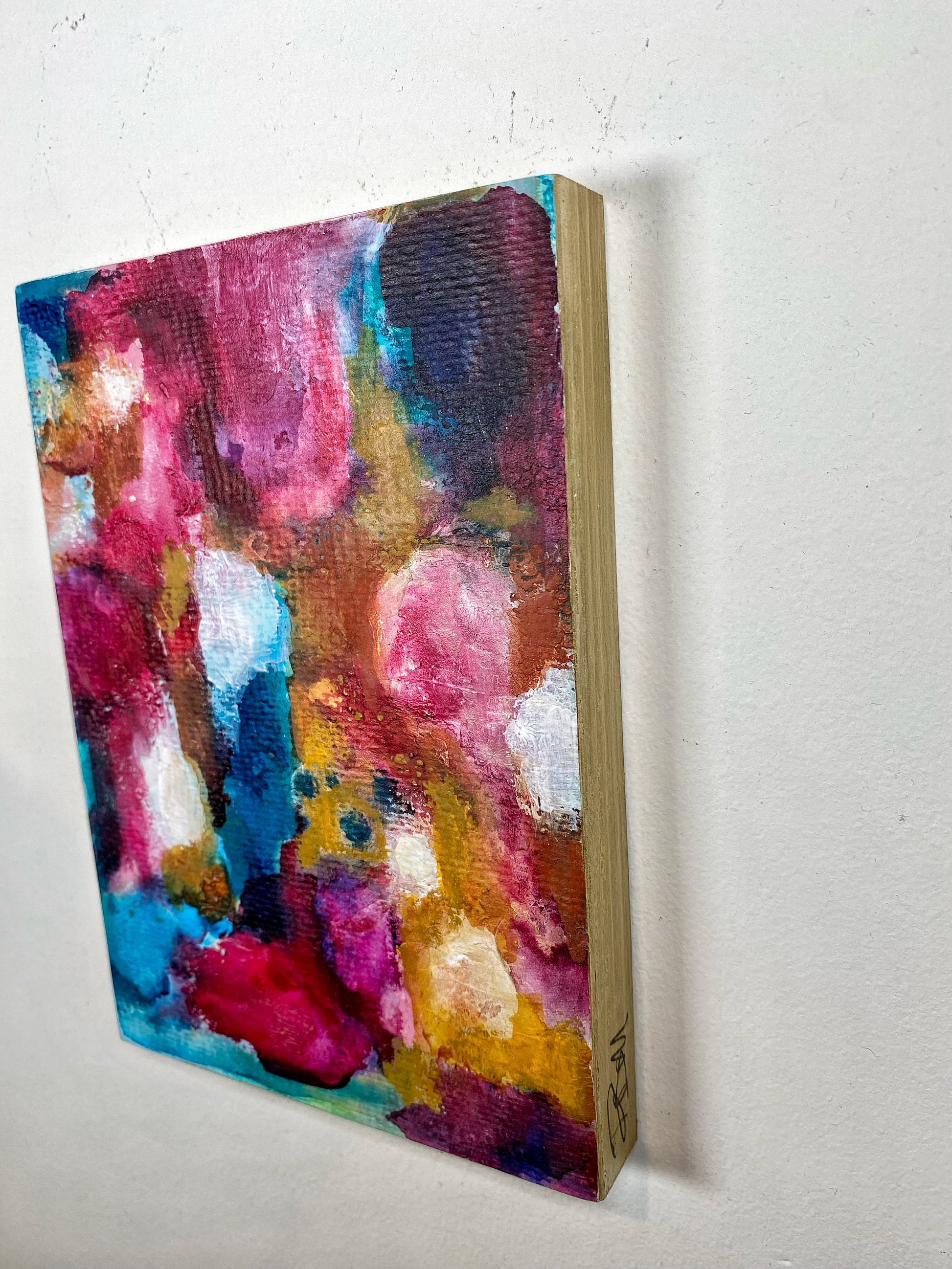 These 5x7 pieces stand on their own, making them a perfect shelf sitter, or can be hung using the cradled wood frame. Some were created as a series of two, three or four, and can be set up that way or individually.
