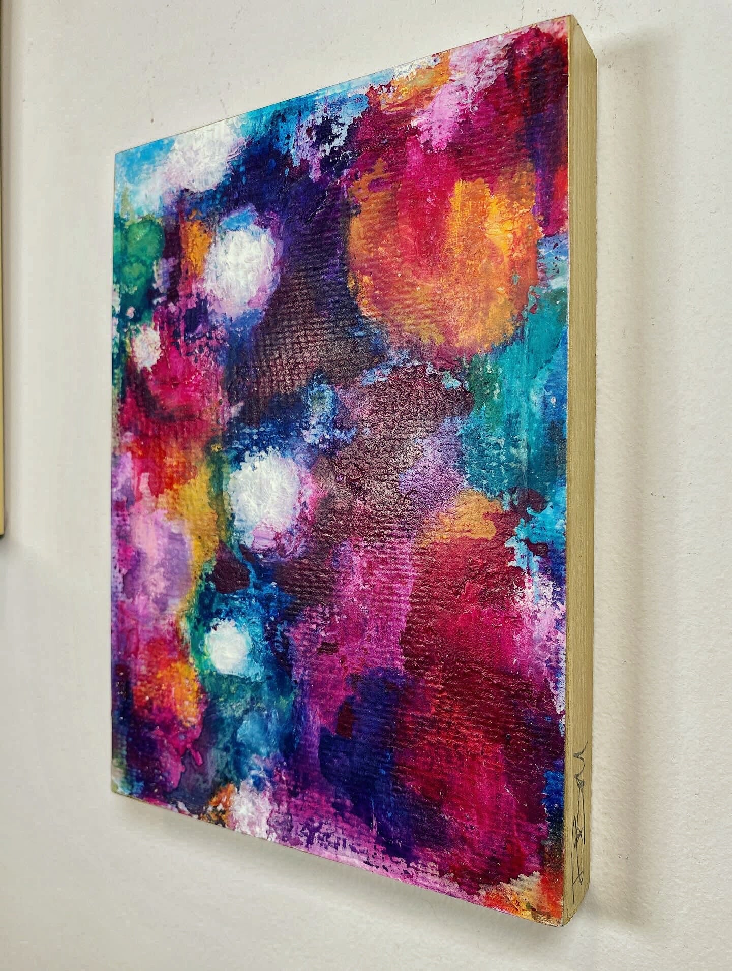 My materials: Caran d’Ache Neocolor ll, concentrated watercolors, acrylic and alcohol ink, acrylic paint, and oil pastels, on 140 lb. cold pressed paper. Mounted on cradled wood panels with gilded muted gold edges. Signed with initials on the side panel and full signature on backs. The finish on these is textural and can look either matte or satin, using archival methods, with the final layer being burnished cold wax.