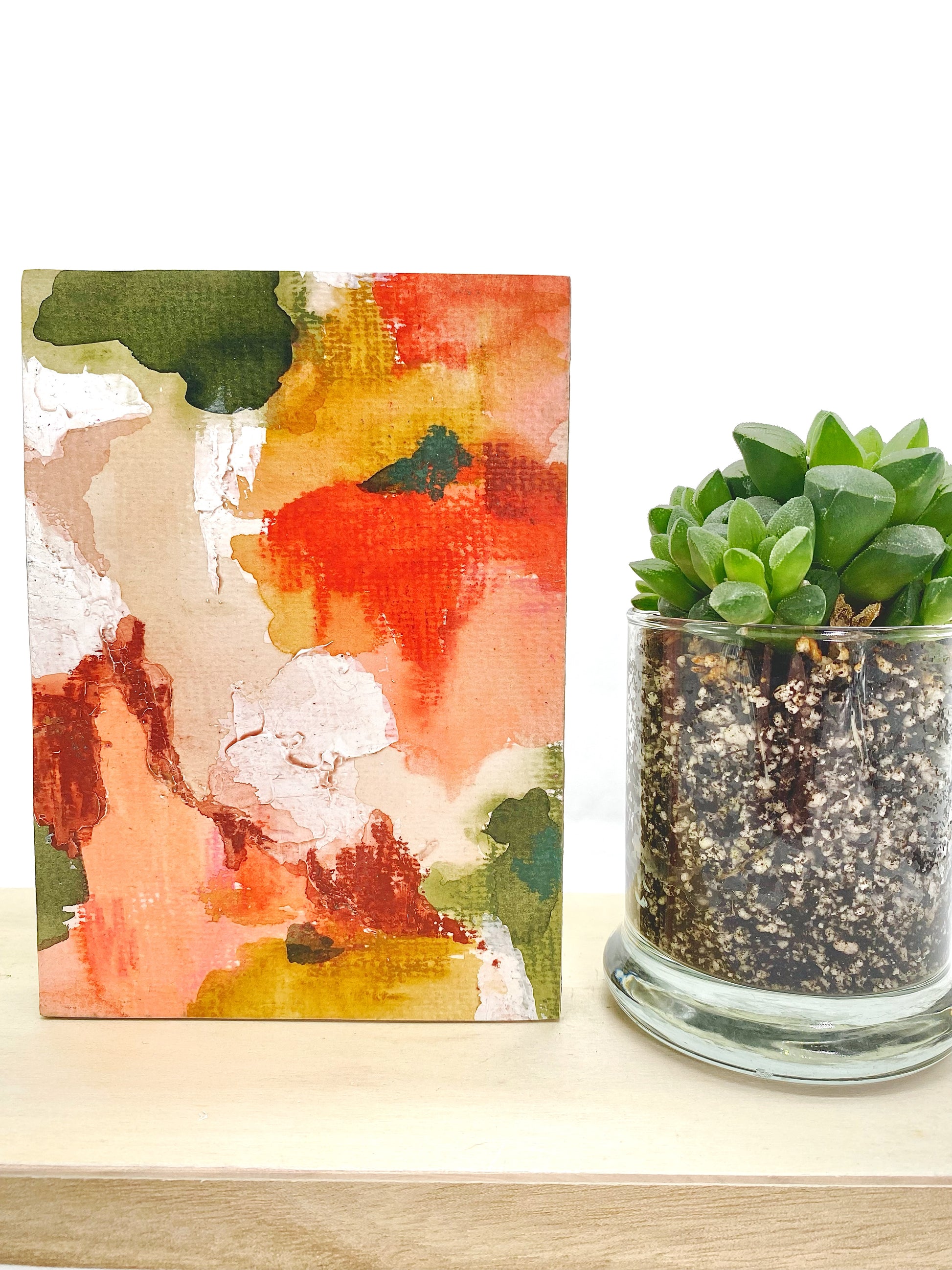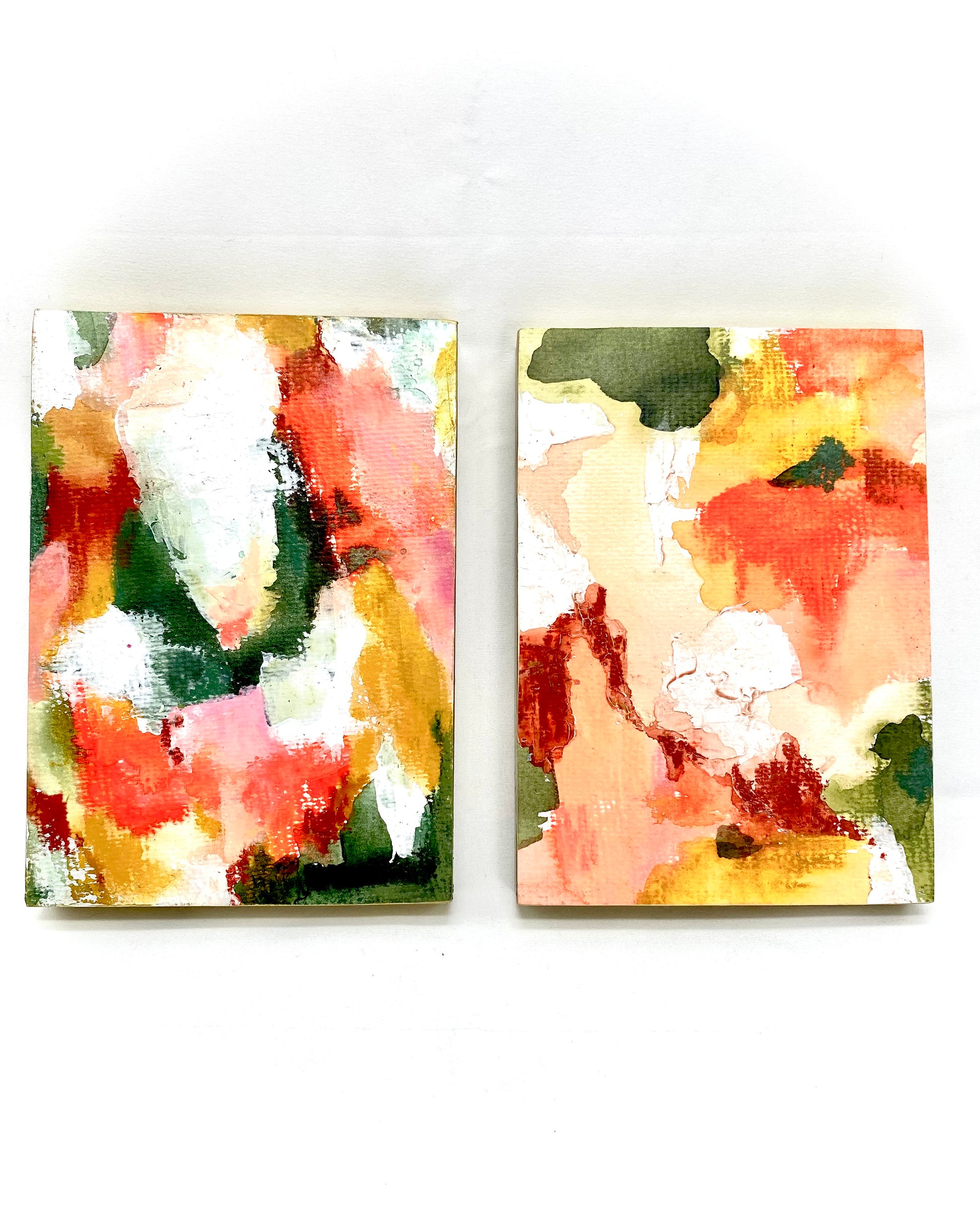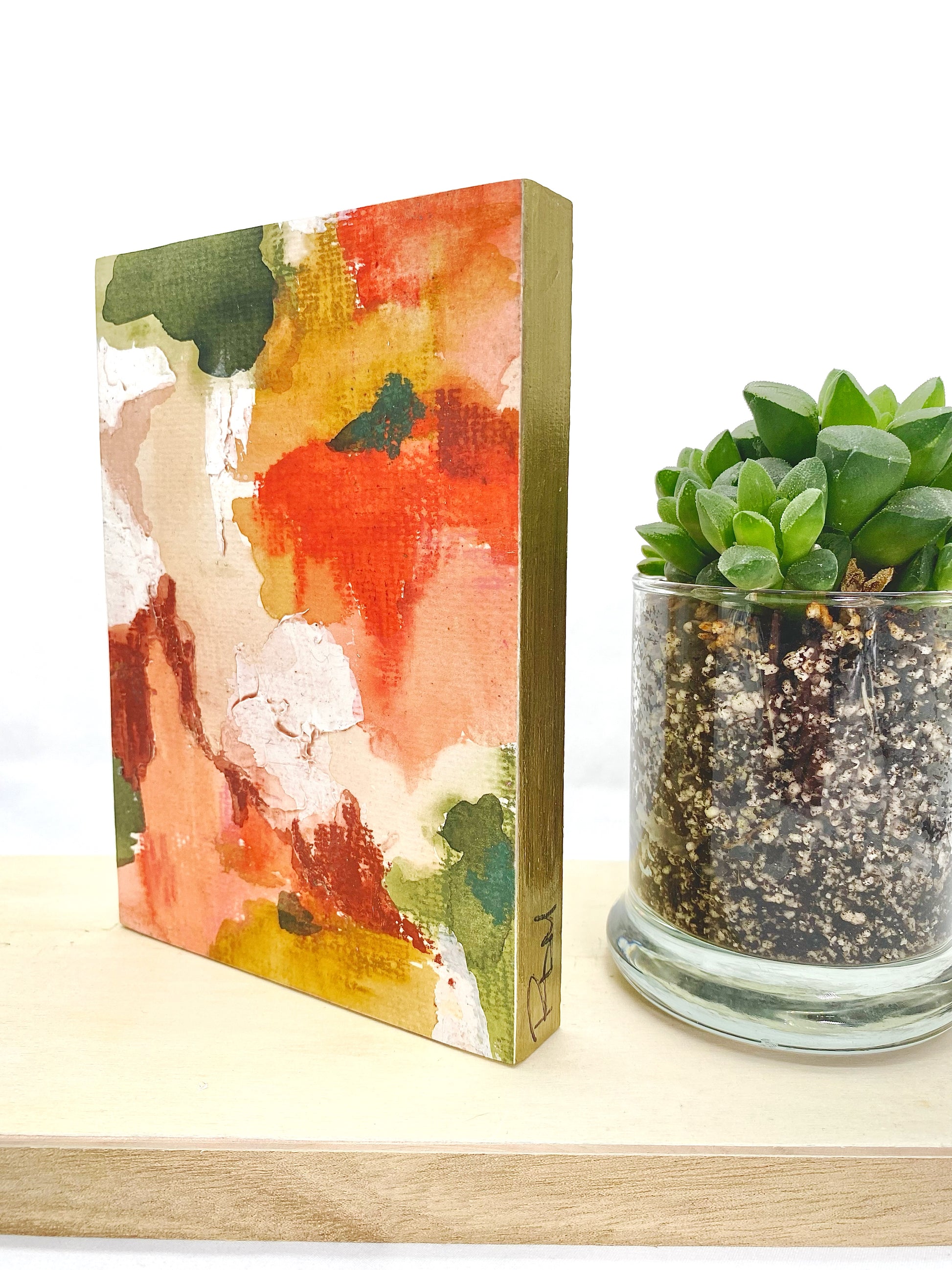 These 5x7 pieces stand on their own, making them a perfect shelf sitter, or can be hung using the cradled wood frame. Some were created as a series of two, three or four, and can be set up that way or individually.