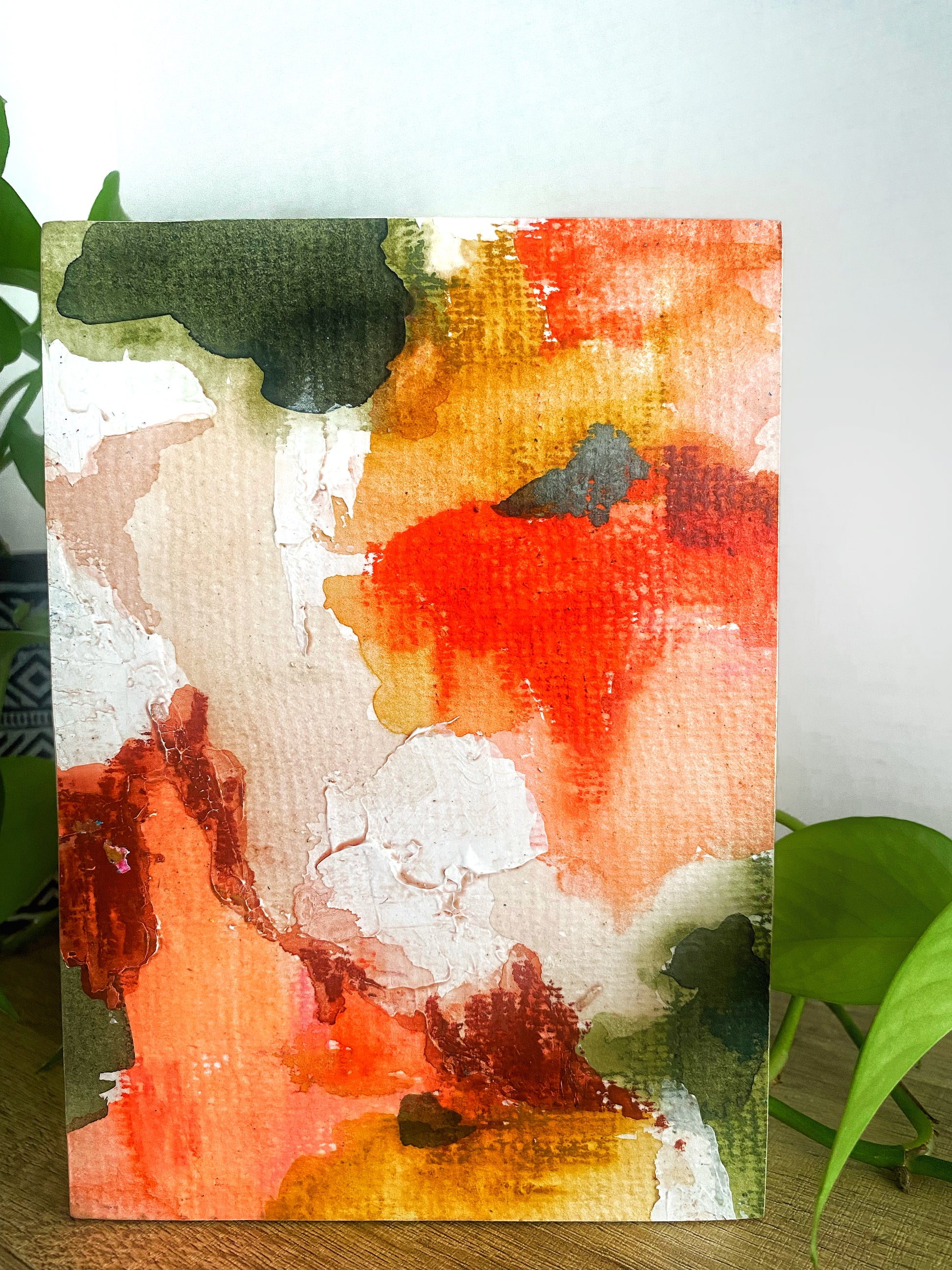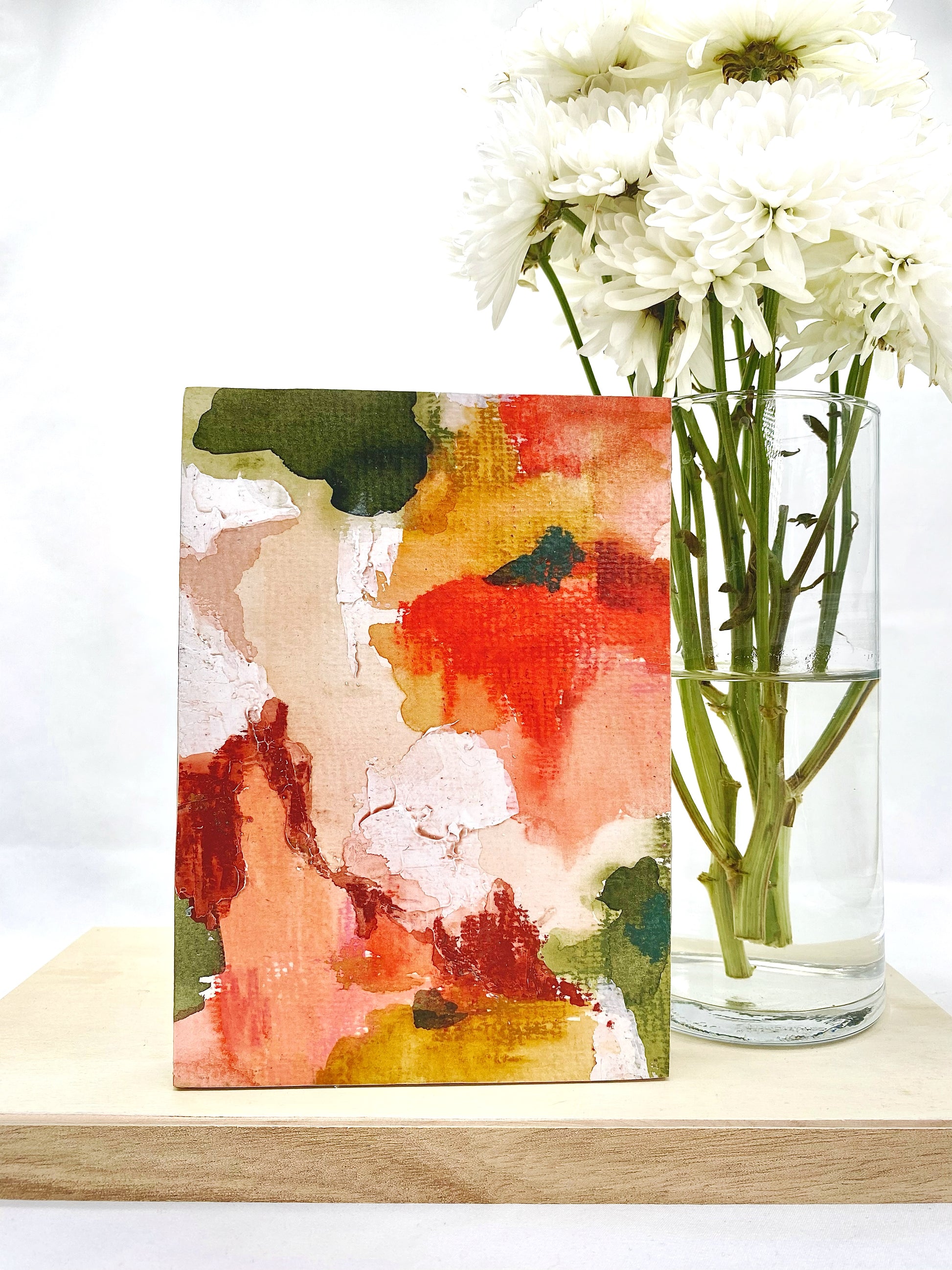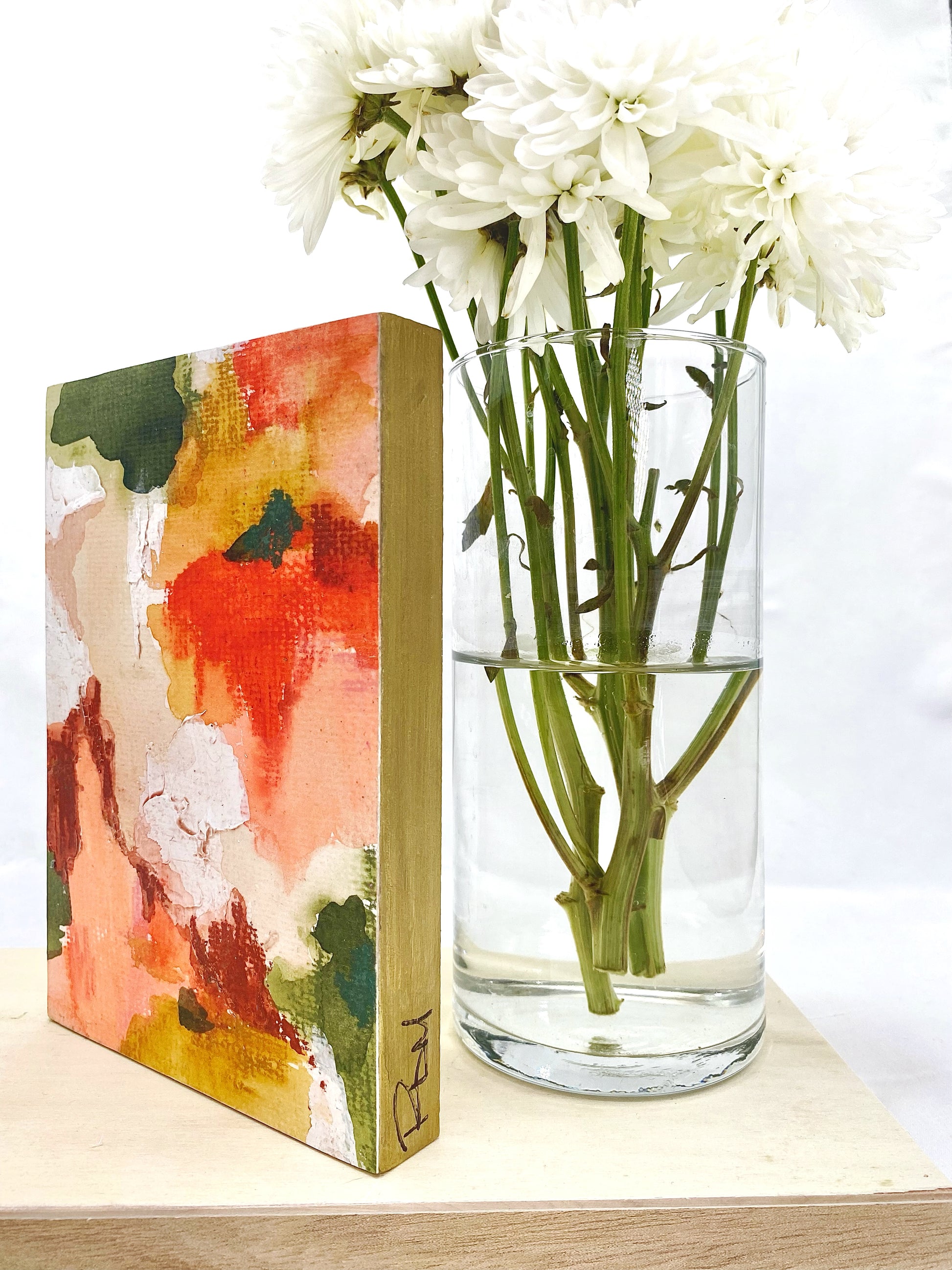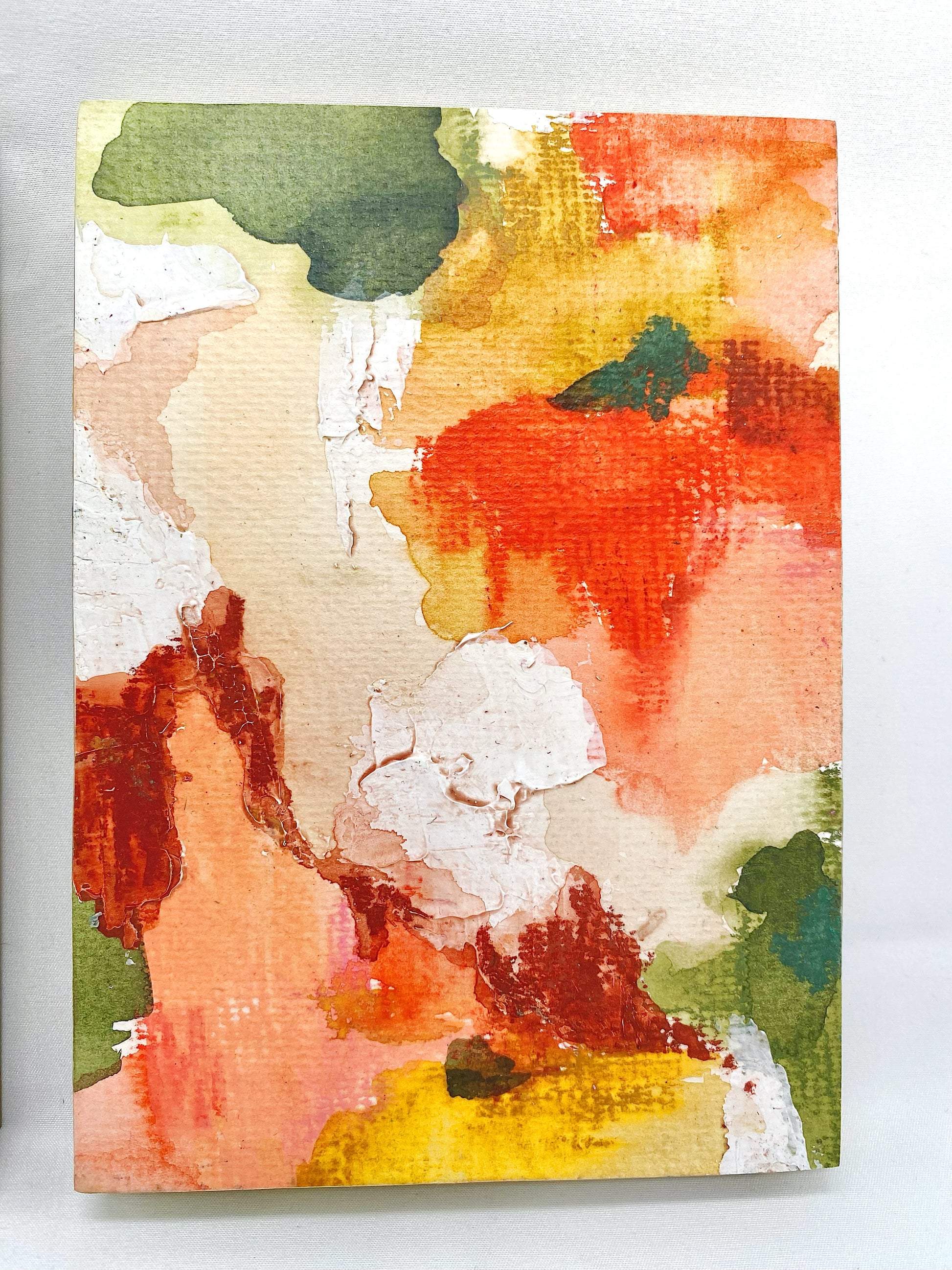 These 5x7 pieces stand on their own, making them a perfect shelf sitter, or can be hung using the cradled wood frame. Some were created as a series of two, three or four, and can be set up that way or individually.