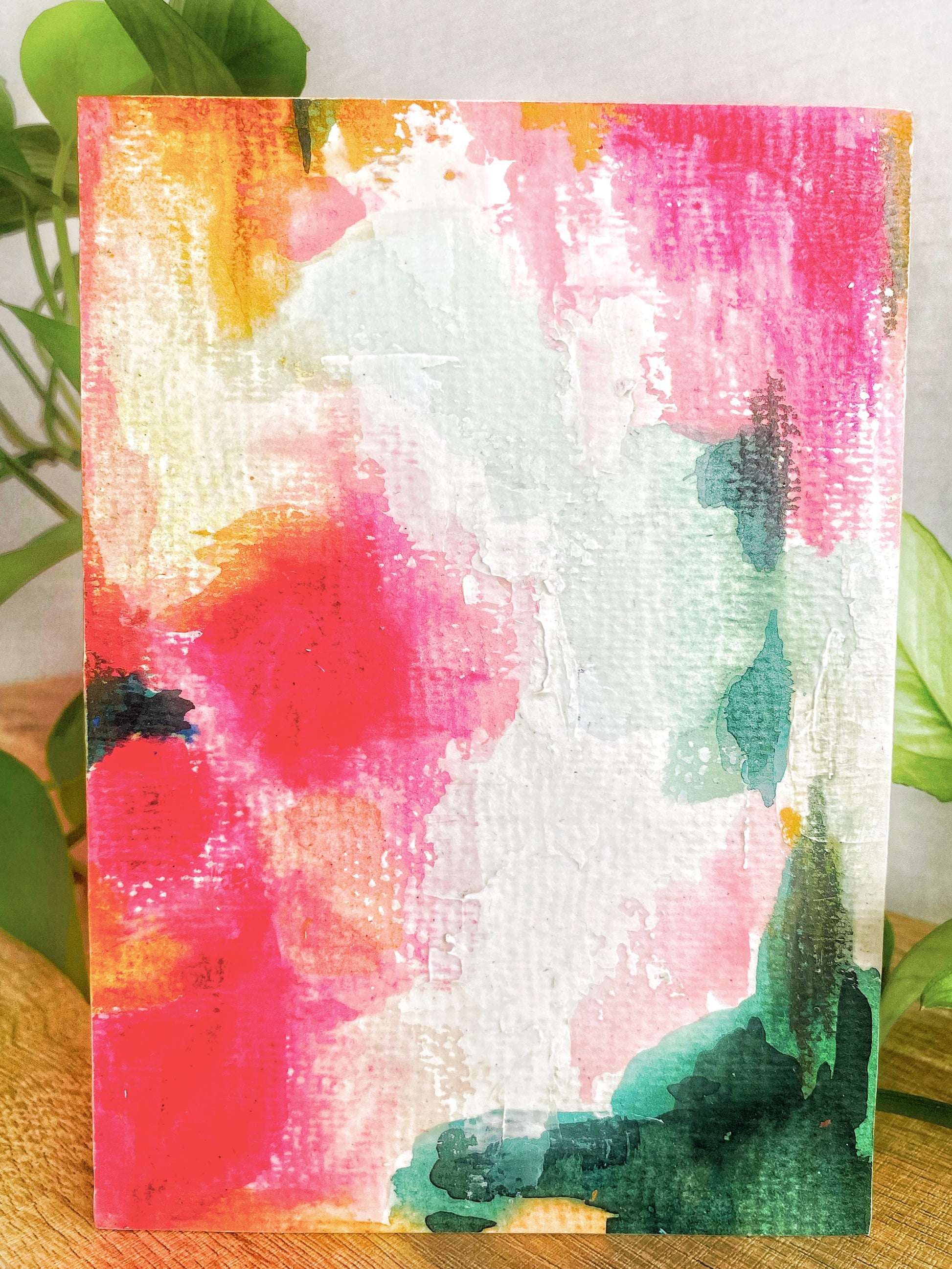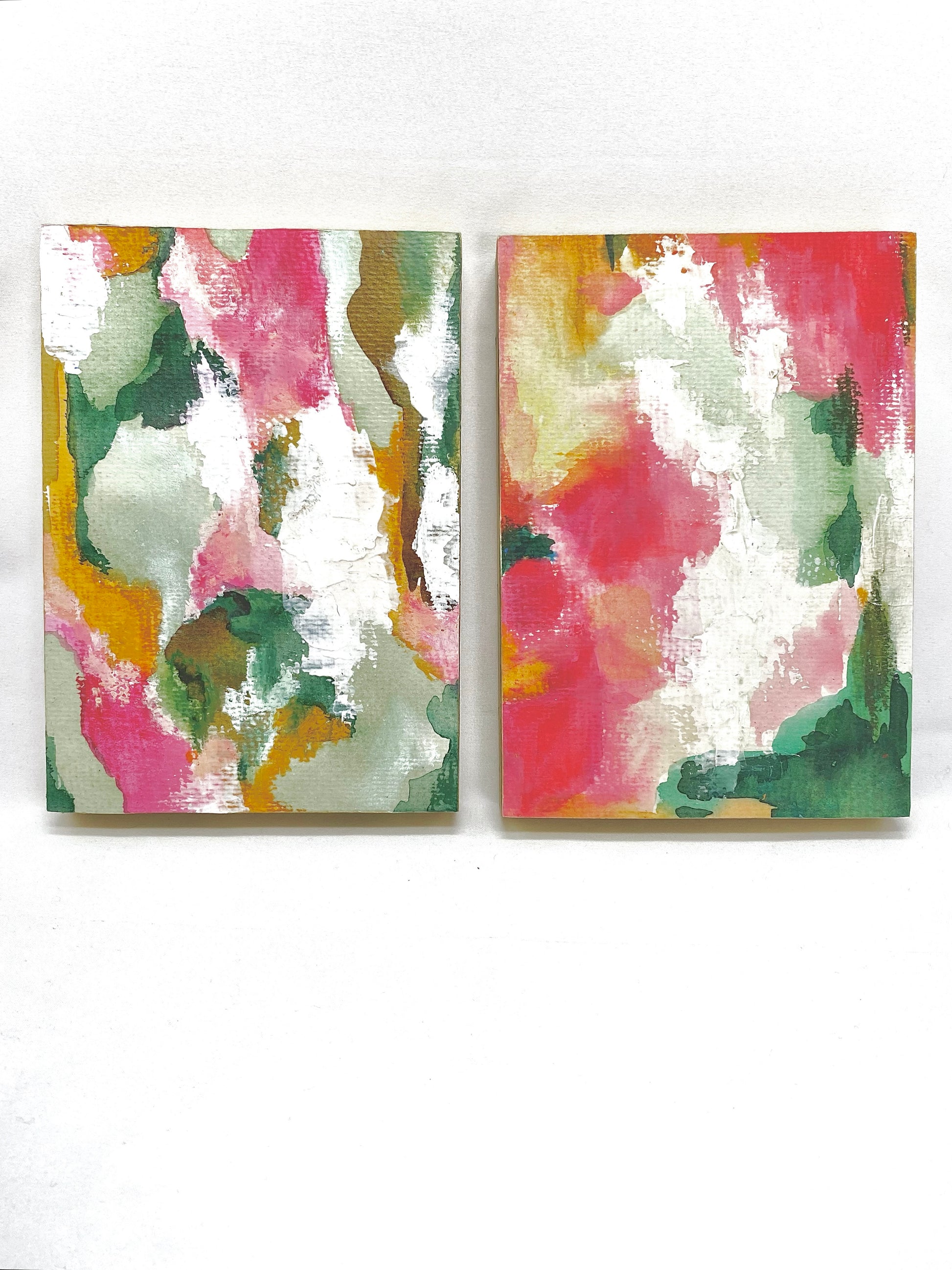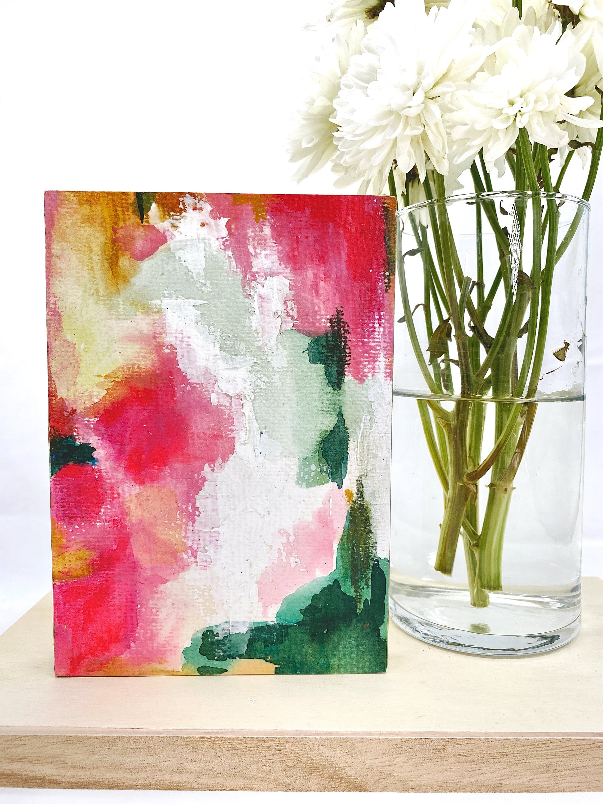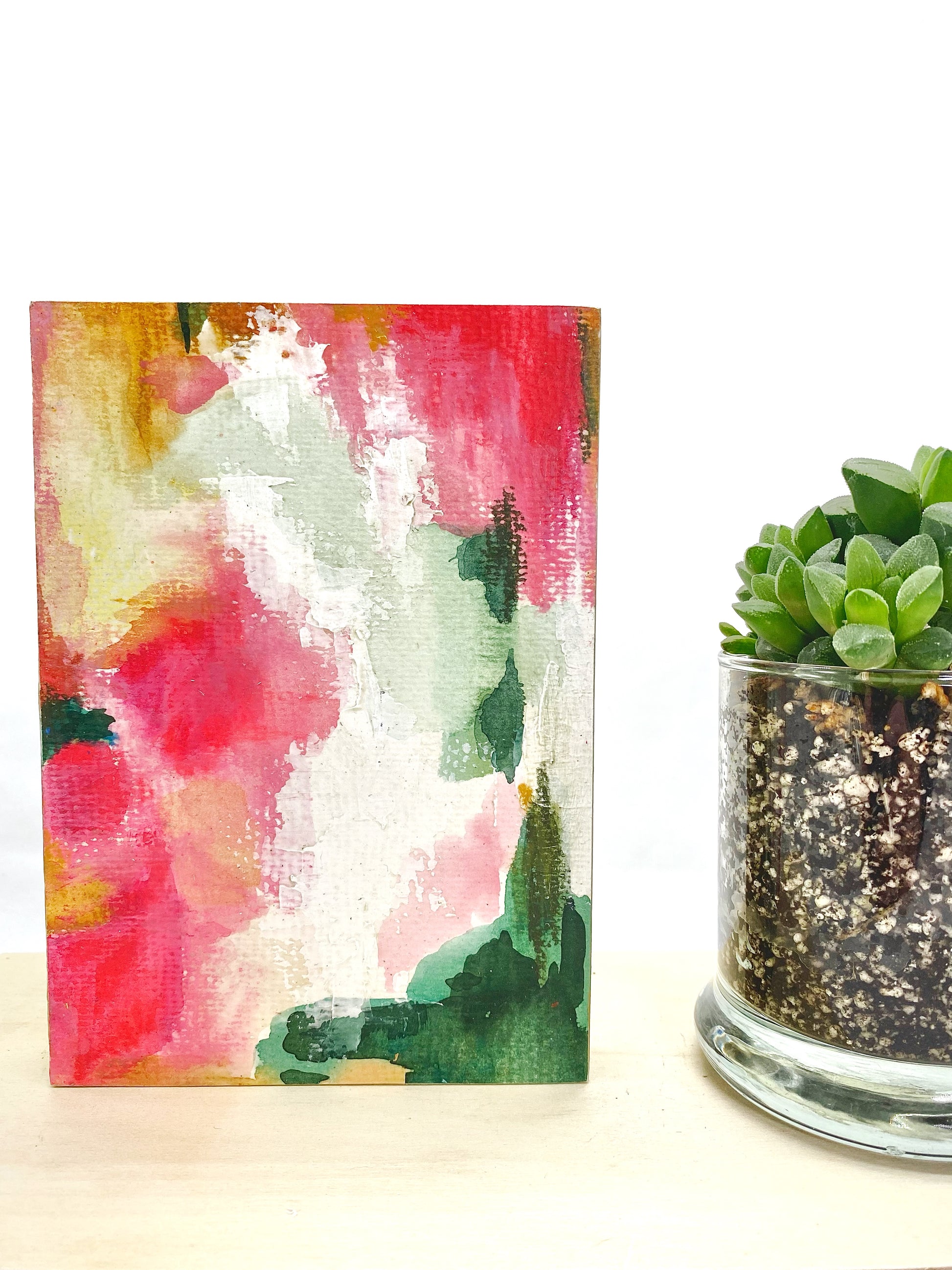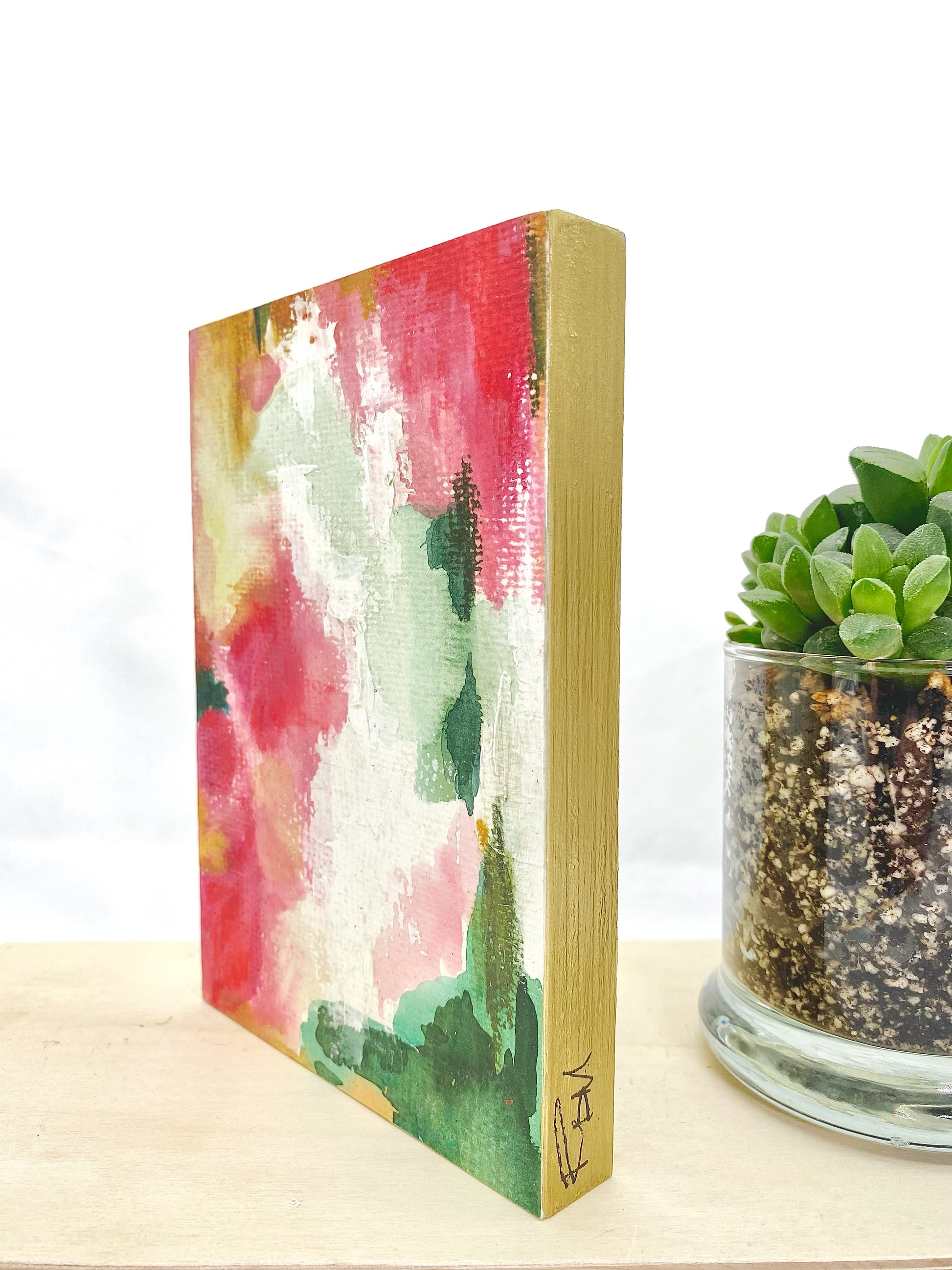 These 5x7 pieces stand on their own, making them a perfect shelf sitter, or can be hung using the cradled wood frame. Some were created as a series of two, three or four, and can be set up that way or individually.