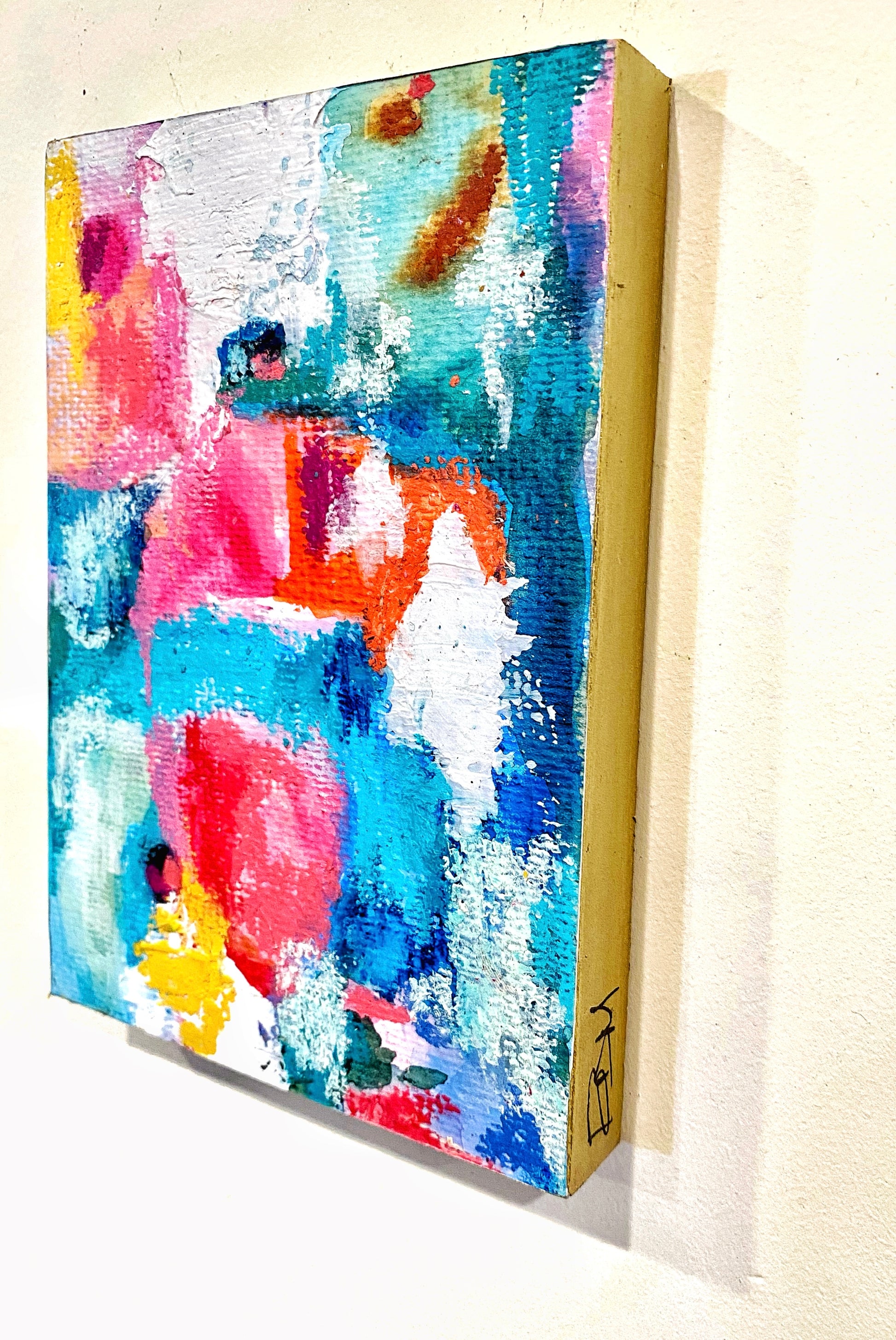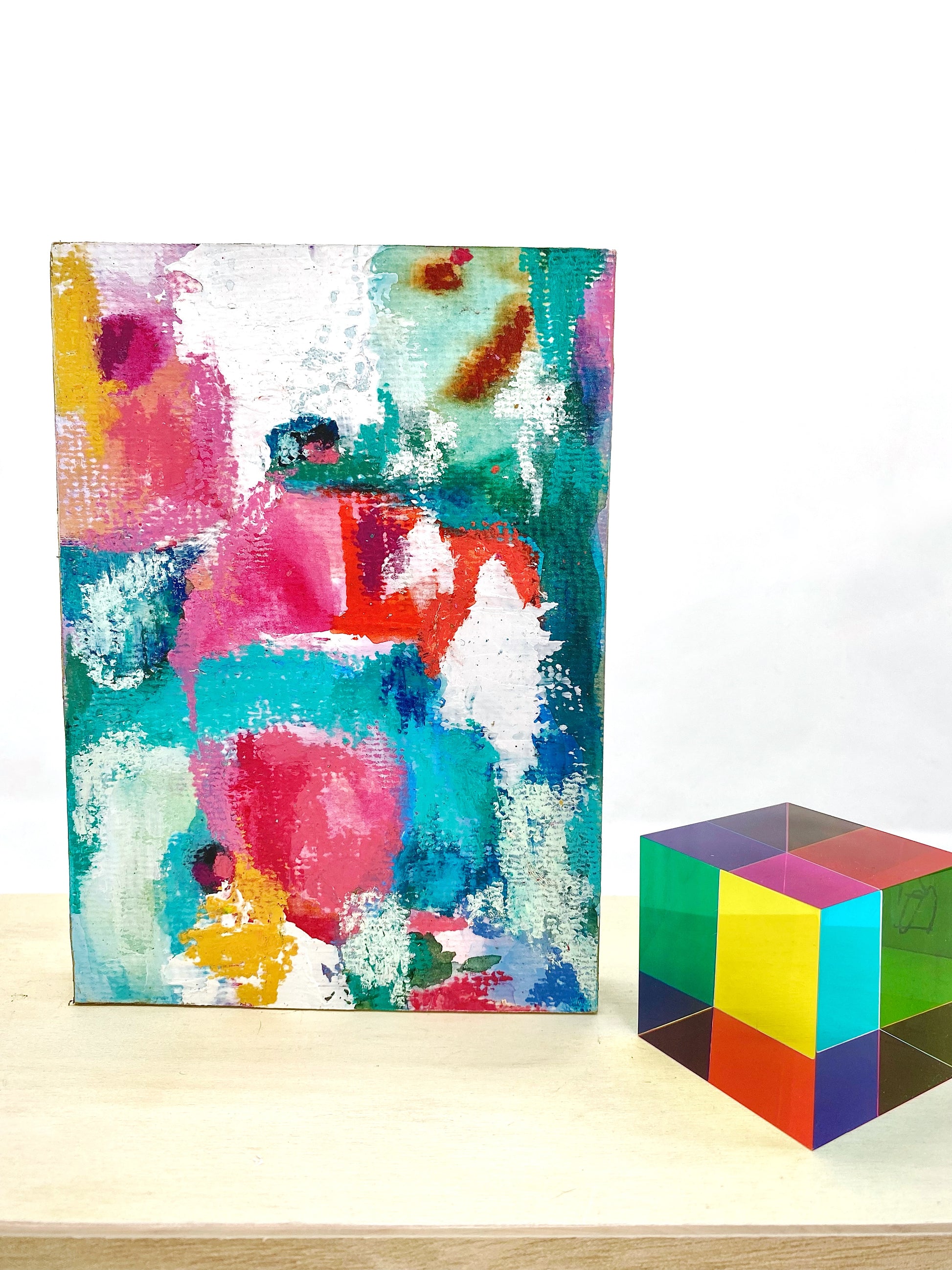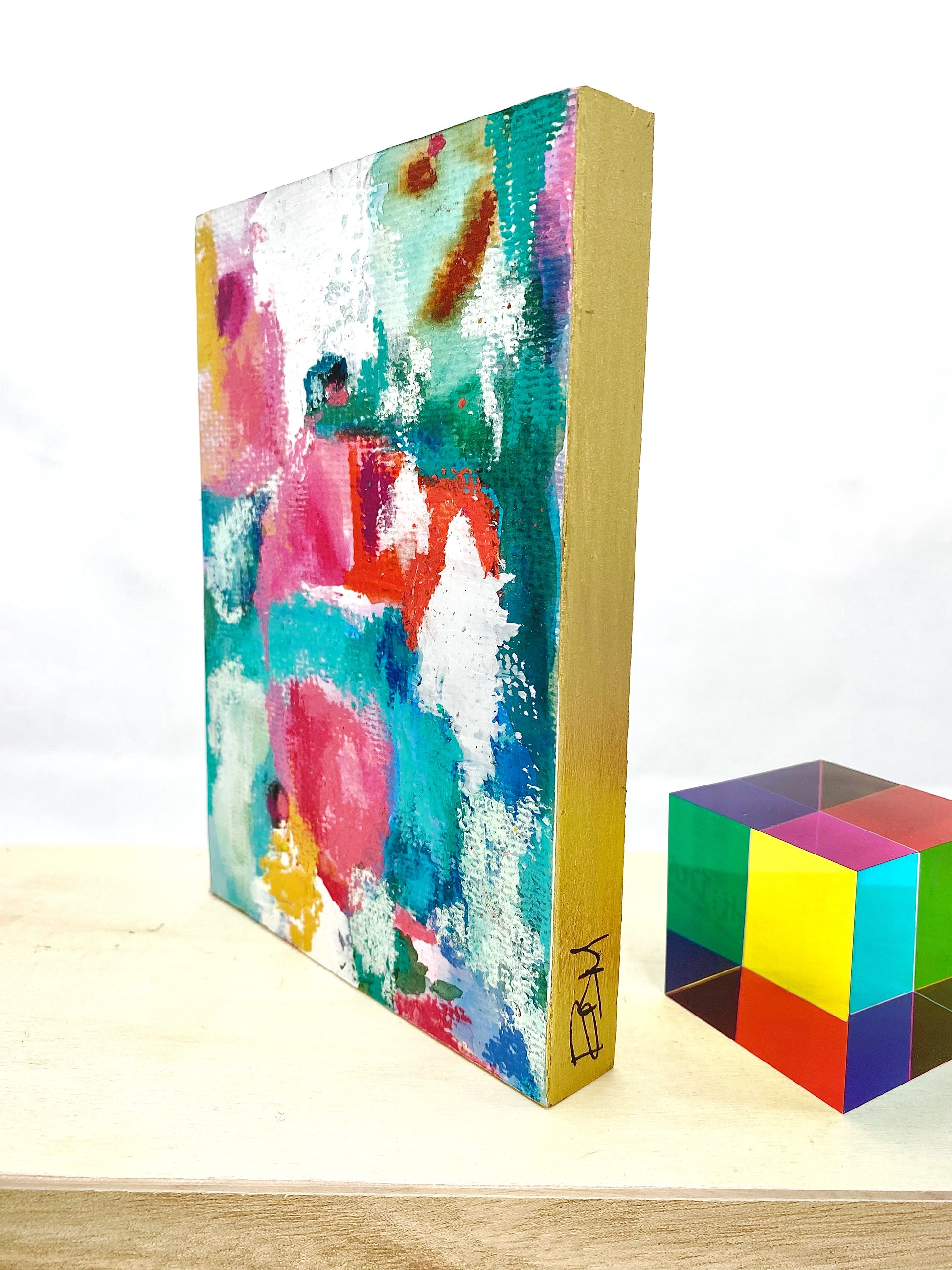 My materials: Caran d’Ache Neocolor ll, concentrated watercolors, acrylic and alcohol ink, acrylic paint, and oil pastels, on 140 lb. cold pressed paper. Mounted on cradled wood panels with gilded muted gold edges. Signed with initials on the side panel and full signature on backs. The finish on these is textural and can look either matte or satin, using archival methods, with the final layer being burnished cold wax.