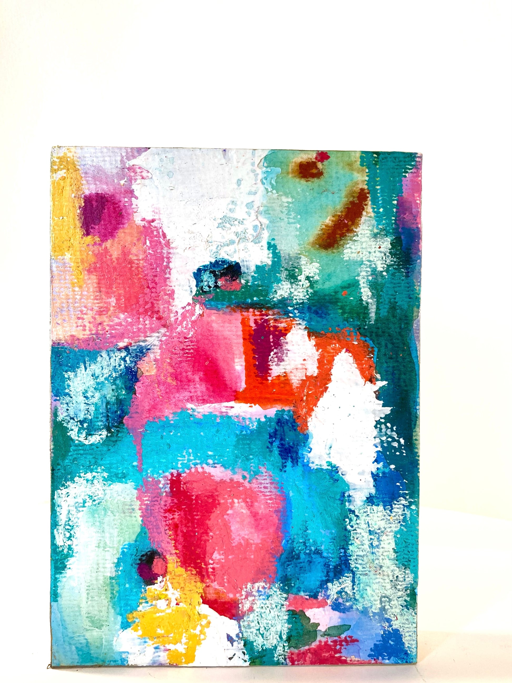 These 5x7 pieces stand on their own, making them a perfect shelf sitter, or can be hung using the cradled wood frame. Some were created as a series of two, three or four, and can be set up that way or individually.