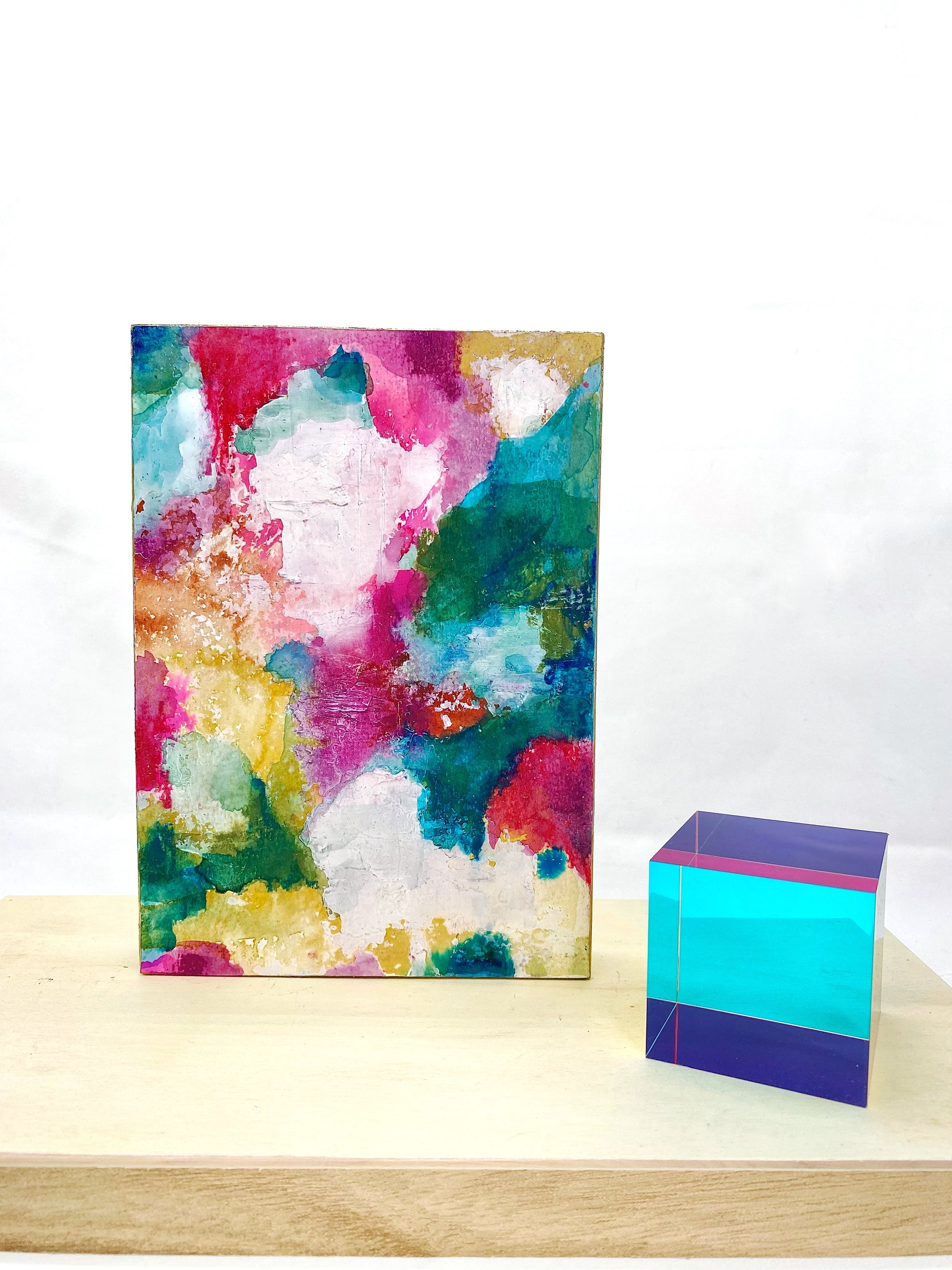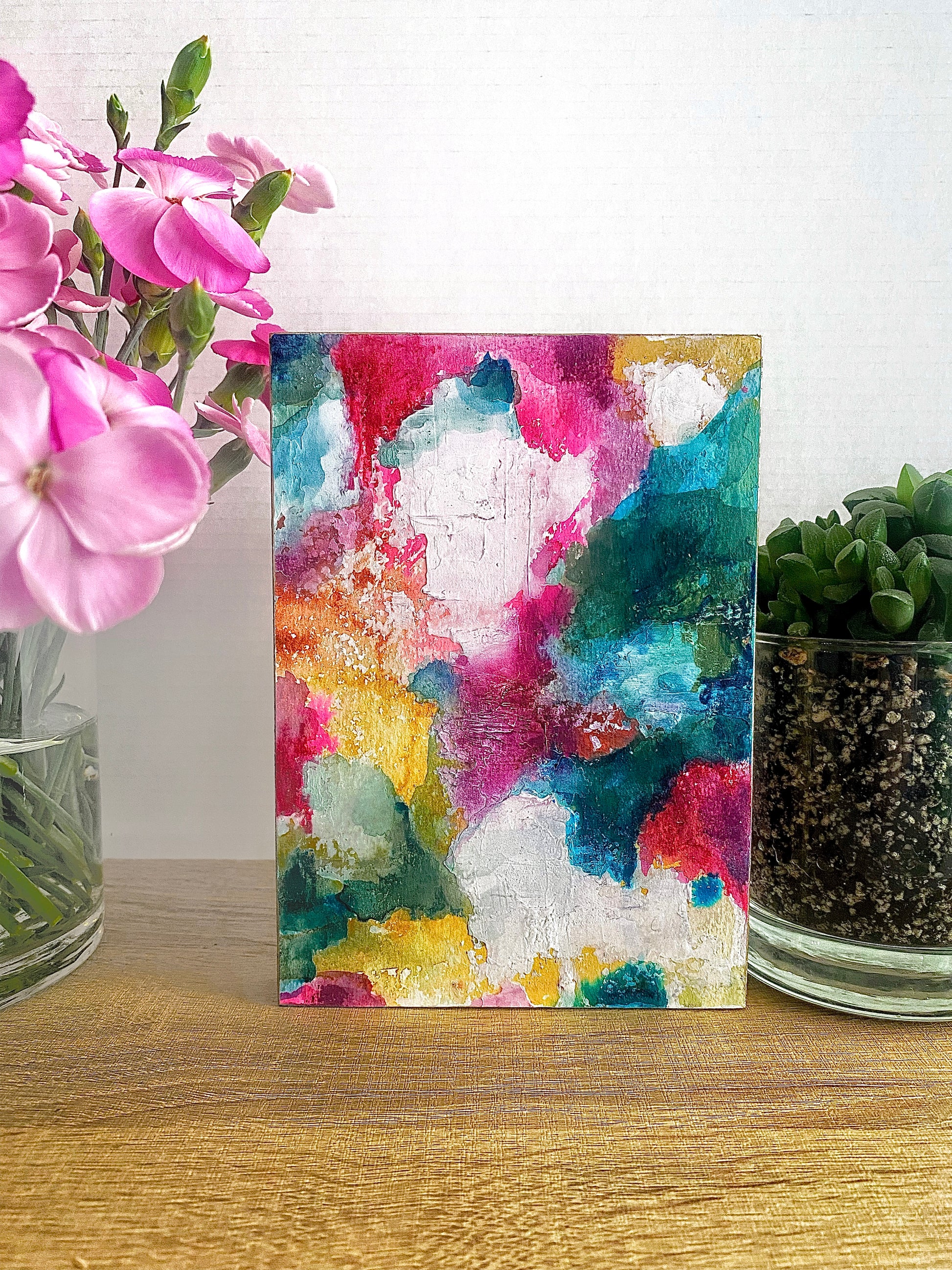 These 5x7 pieces stand on their own, making them a perfect shelf sitter, or can be hung using the cradled wood frame. Some were created as a series of two, three or four, and can be set up that way or individually.