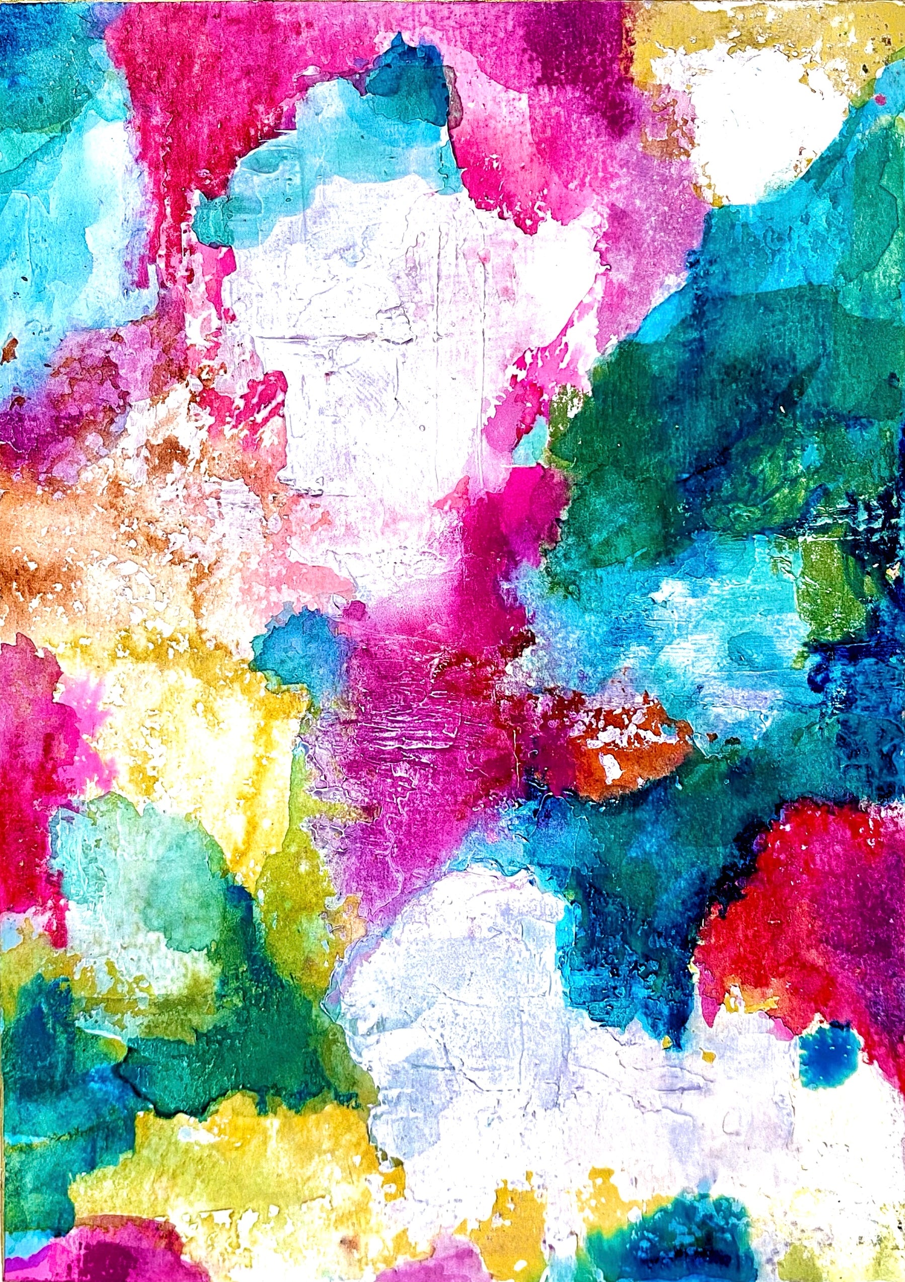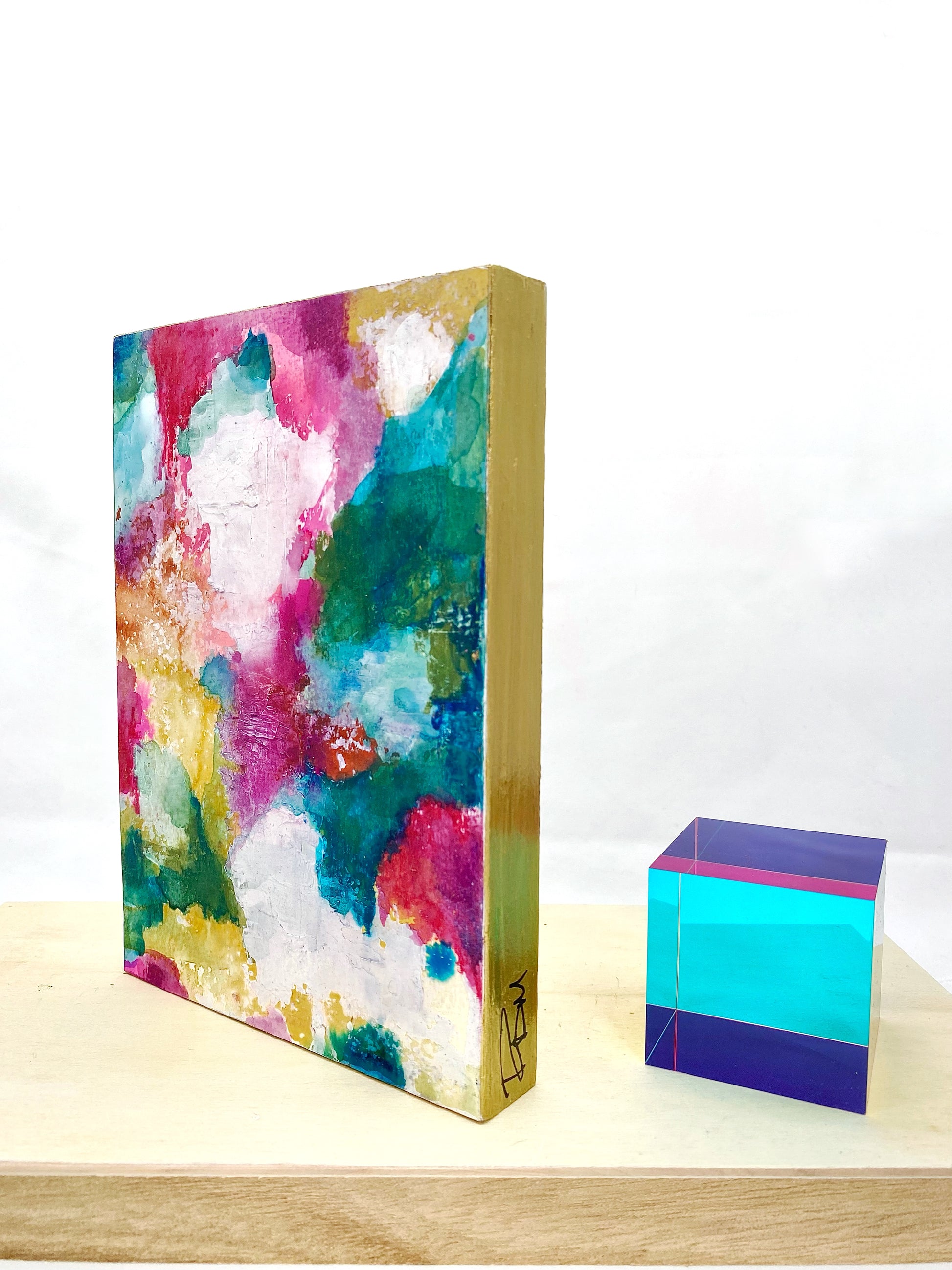 My materials: Caran d’Ache Neocolor ll, concentrated watercolors, acrylic and alcohol ink, acrylic paint, and oil pastels, on 140 lb. cold pressed paper. Mounted on cradled wood panels with gilded muted gold edges. Signed with initials on the side panel and full signature on backs. The finish on these is textural and can look either matte or satin, using archival methods, with the final layer being burnished cold wax.