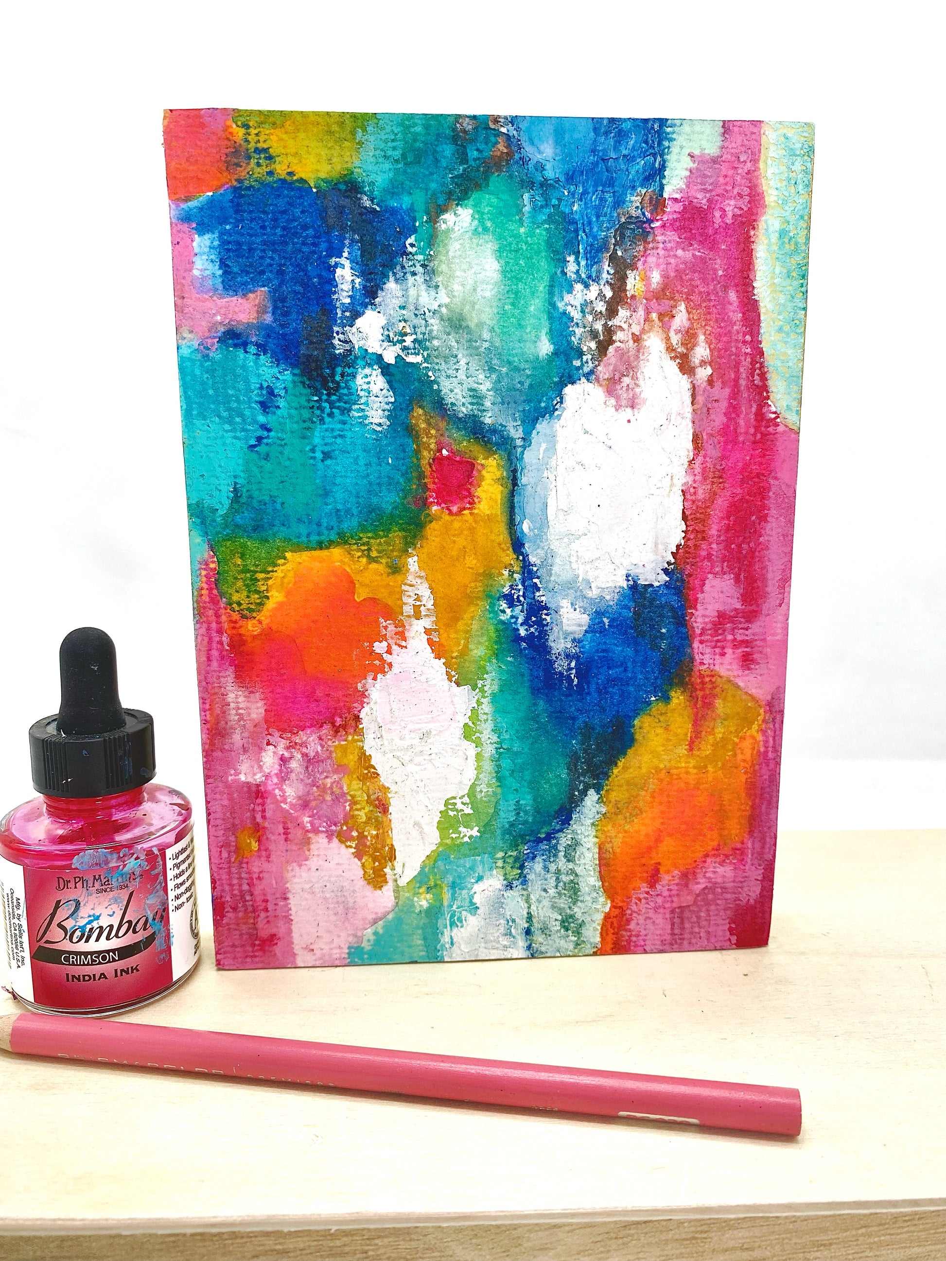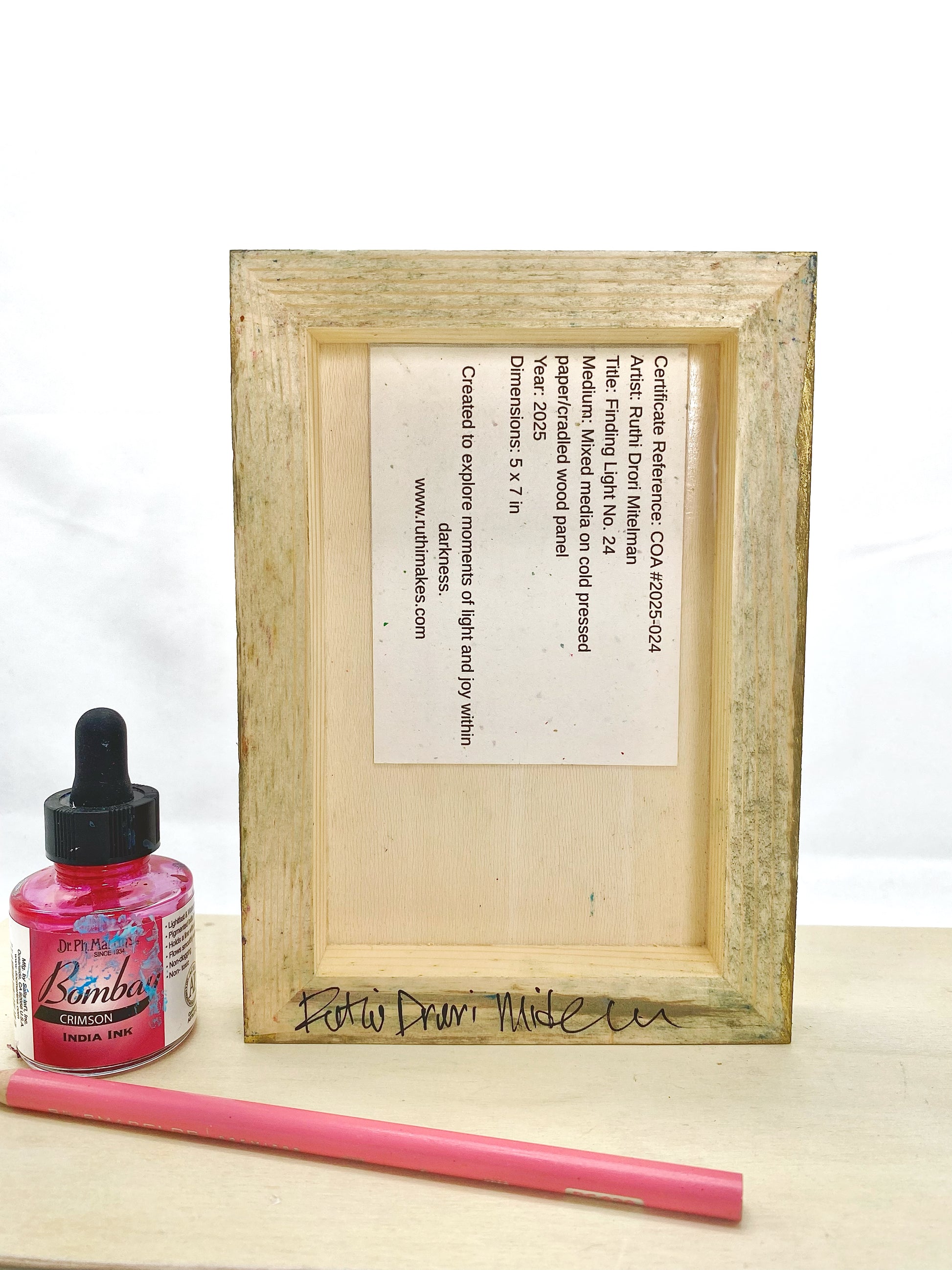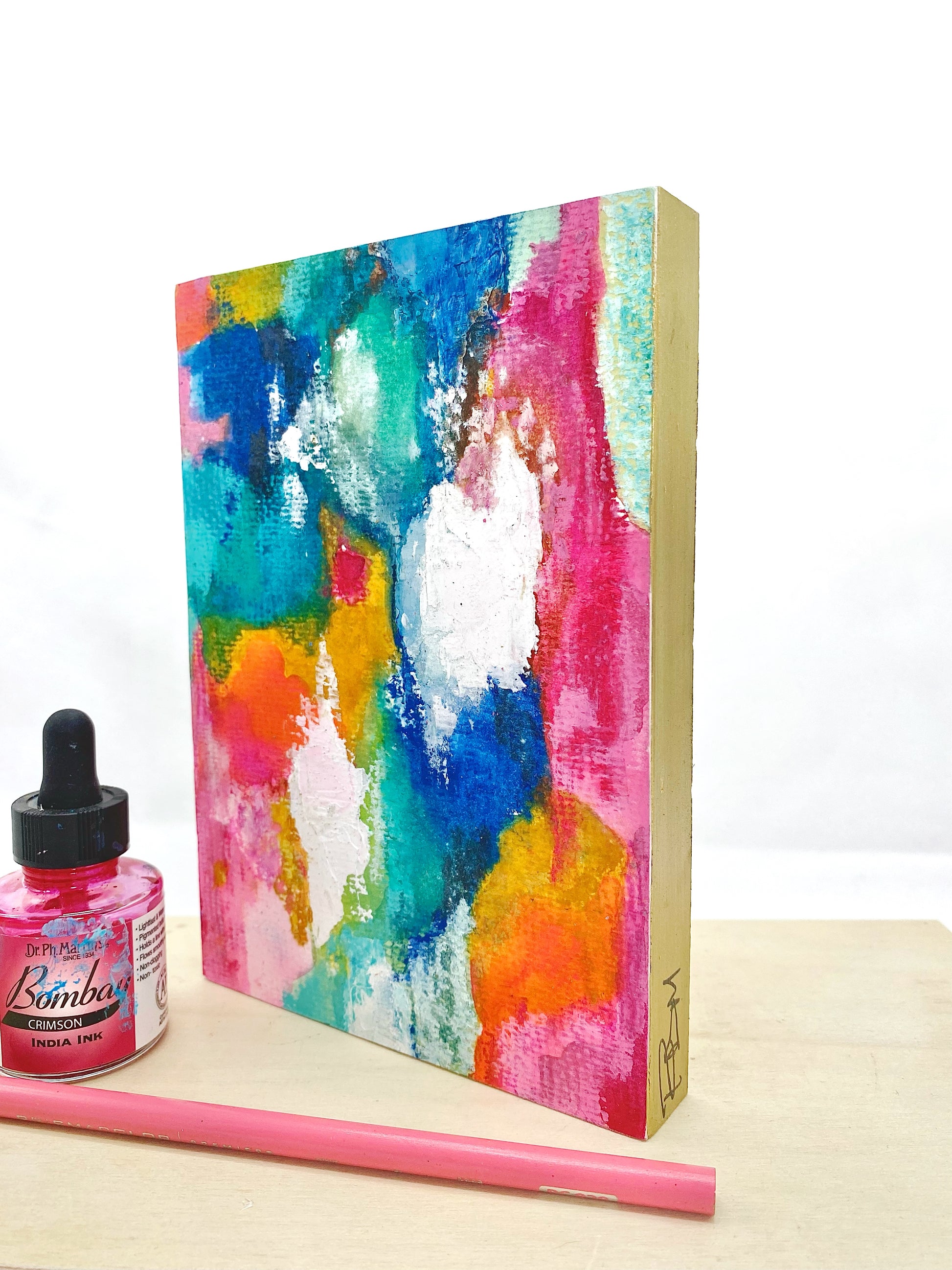 My materials: Caran d’Ache Neocolor ll, concentrated watercolors, acrylic and alcohol ink, acrylic paint, and oil pastels, on 140 lb. cold pressed paper. Mounted on cradled wood panels with gilded muted gold edges. Signed with initials on the side panel and full signature on backs. The finish on these is textural and can look either matte or satin, using archival methods, with the final layer being burnished cold wax.