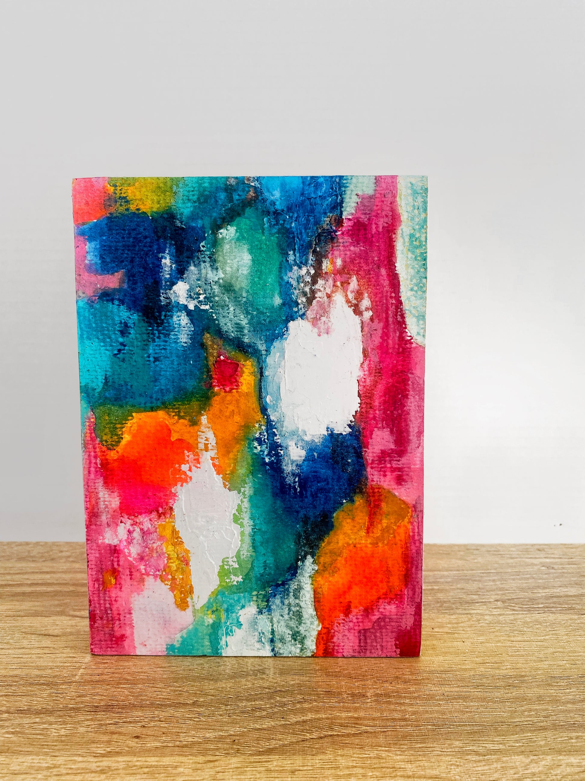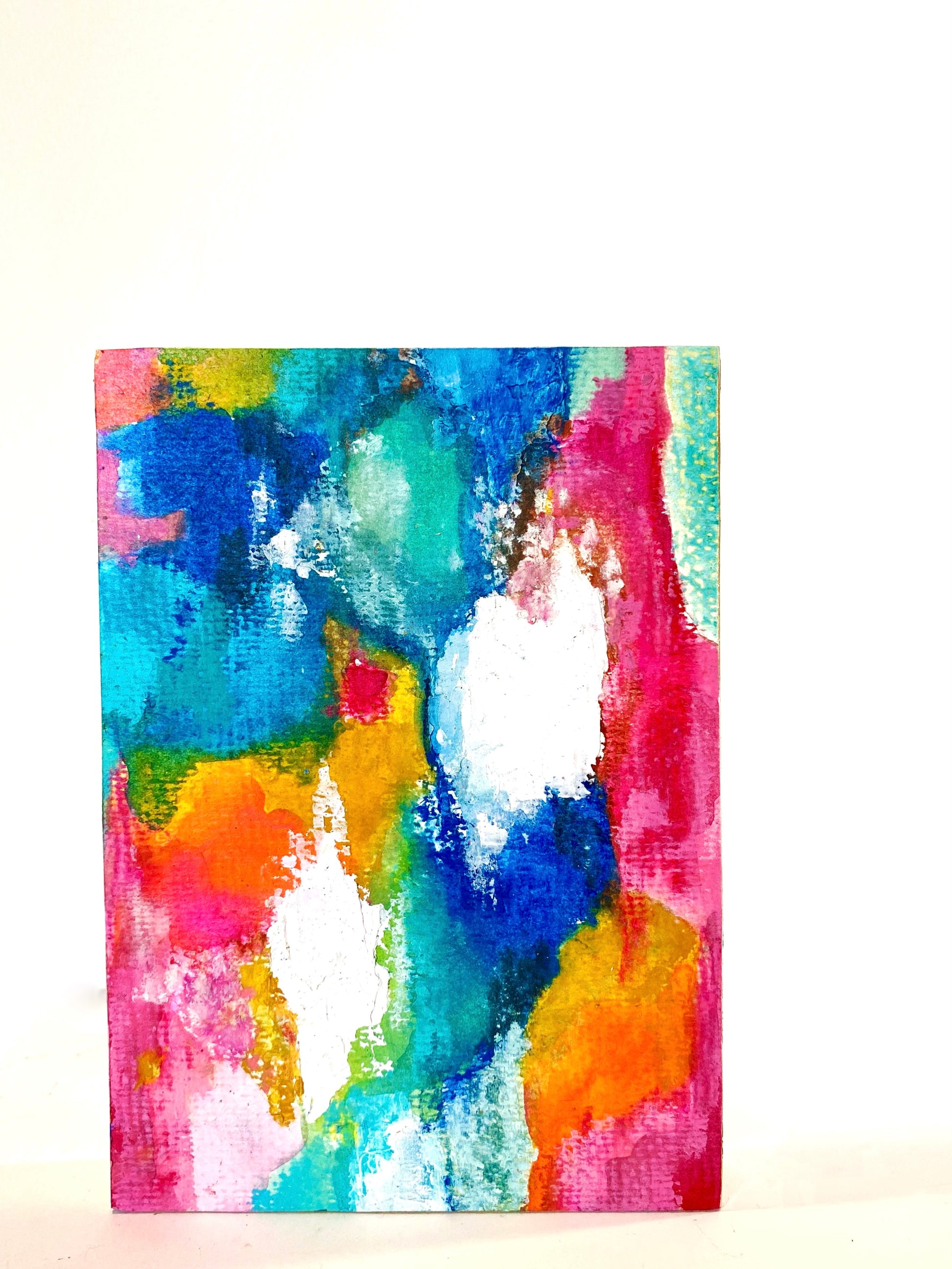 These 5x7 pieces stand on their own, making them a perfect shelf sitter, or can be hung using the cradled wood frame. Some were created as a series of two, three or four, and can be set up that way or individually.