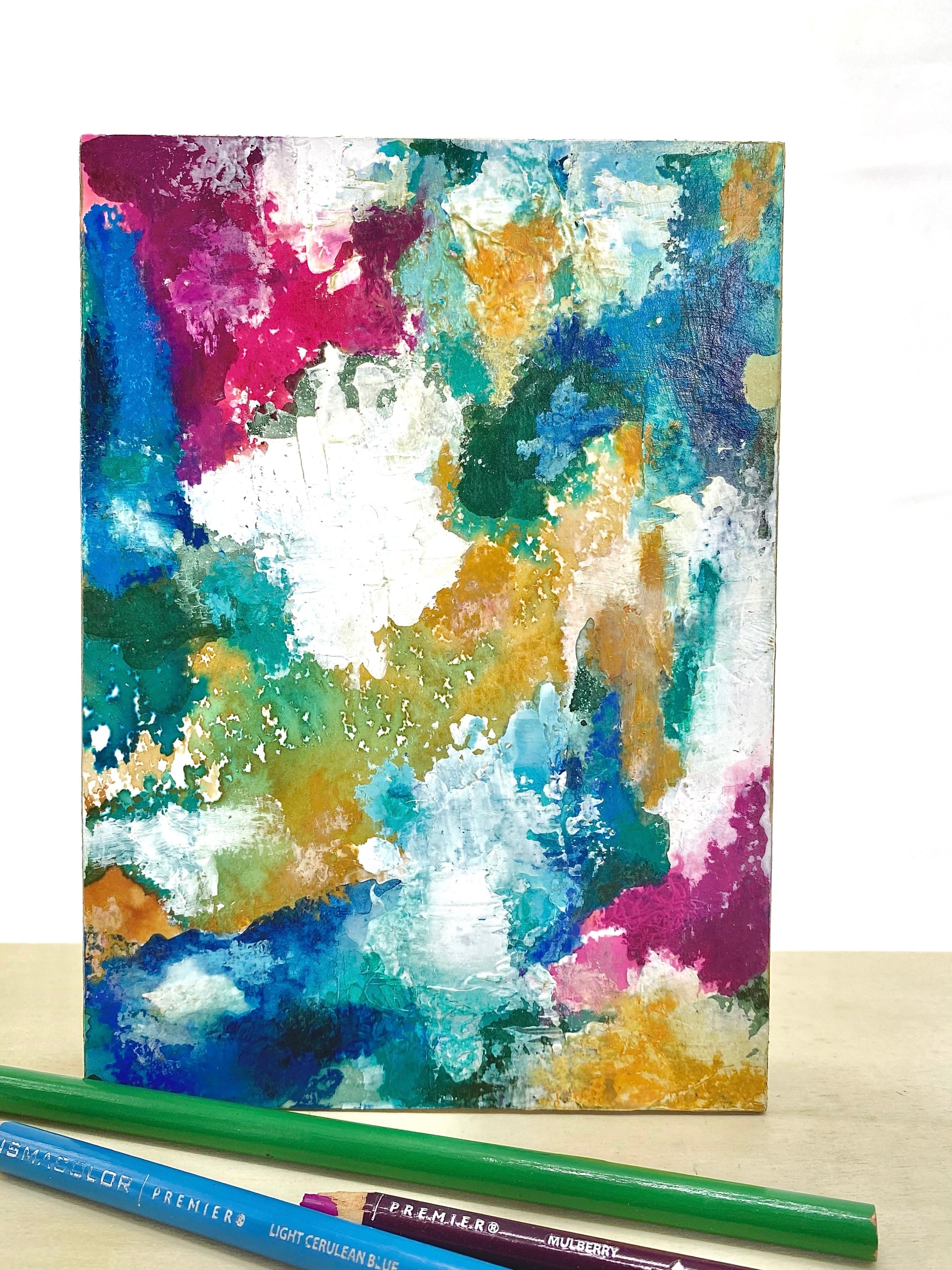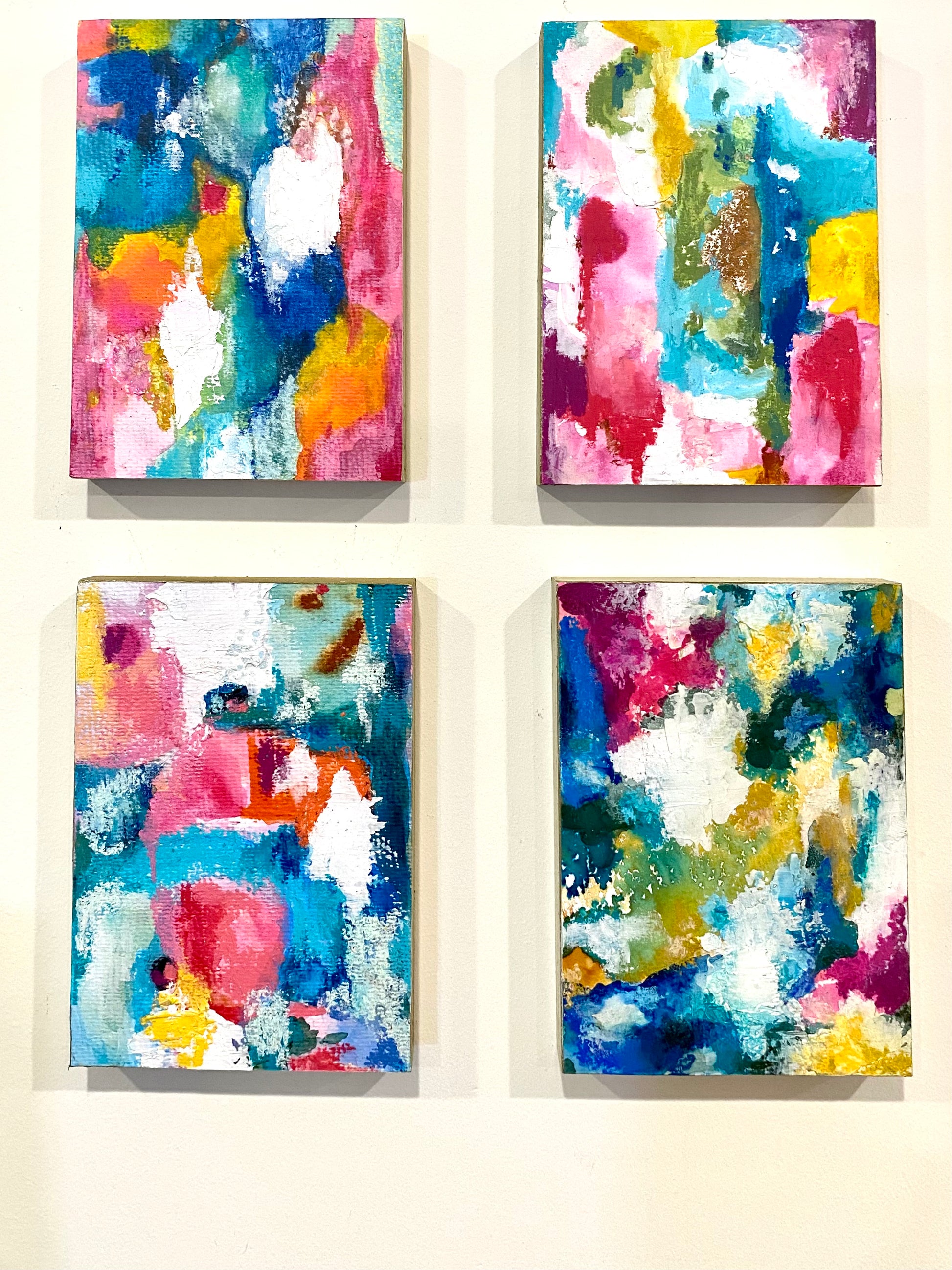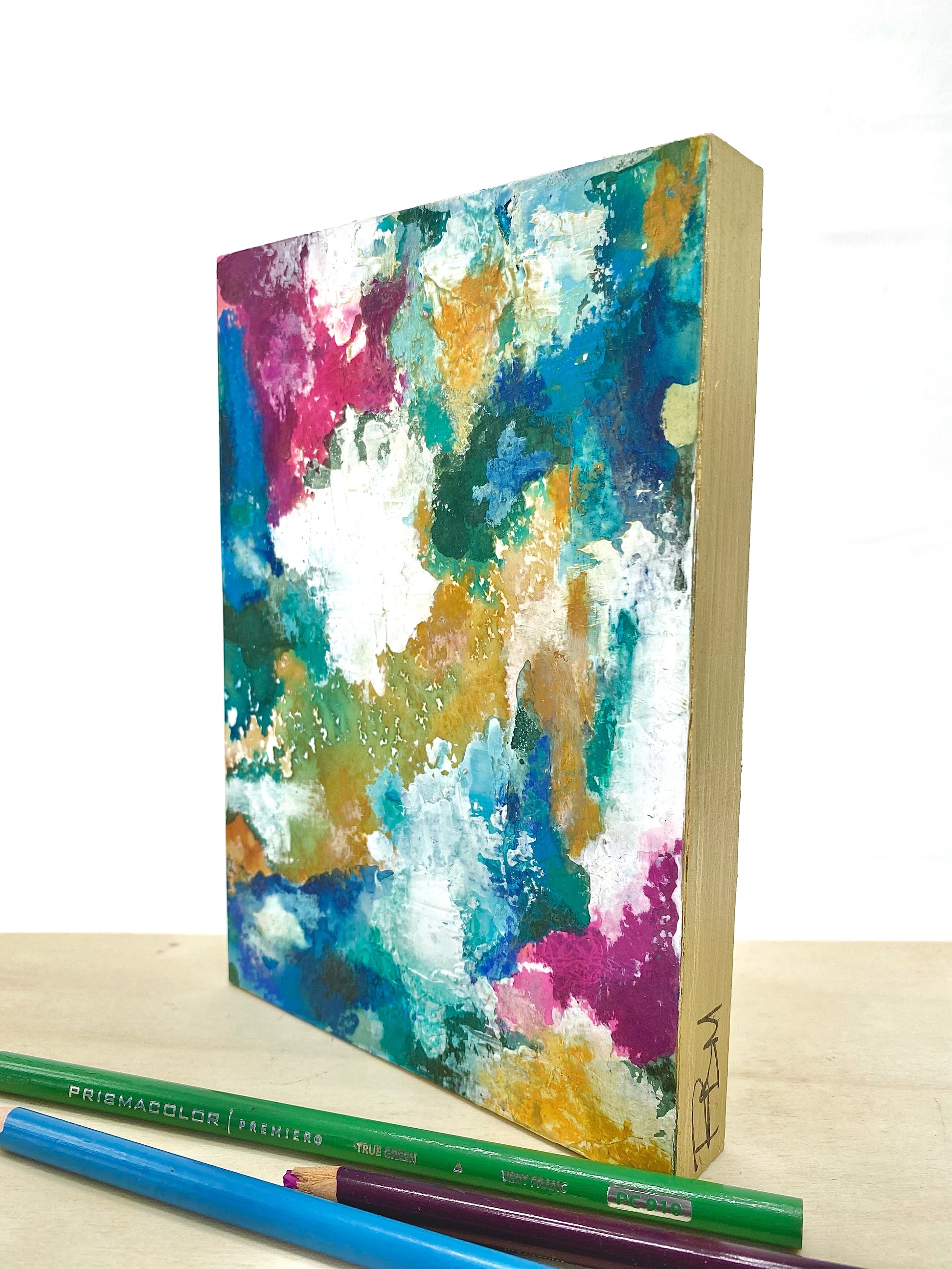 My materials: Caran d’Ache Neocolor ll, concentrated watercolors, acrylic and alcohol ink, acrylic paint, and oil pastels, on 140 lb. cold pressed paper. Mounted on cradled wood panels with gilded muted gold edges. Signed with initials on the side panel and full signature on backs. The finish on these is textural and can look either matte or satin, using archival methods, with the final layer being burnished cold wax.