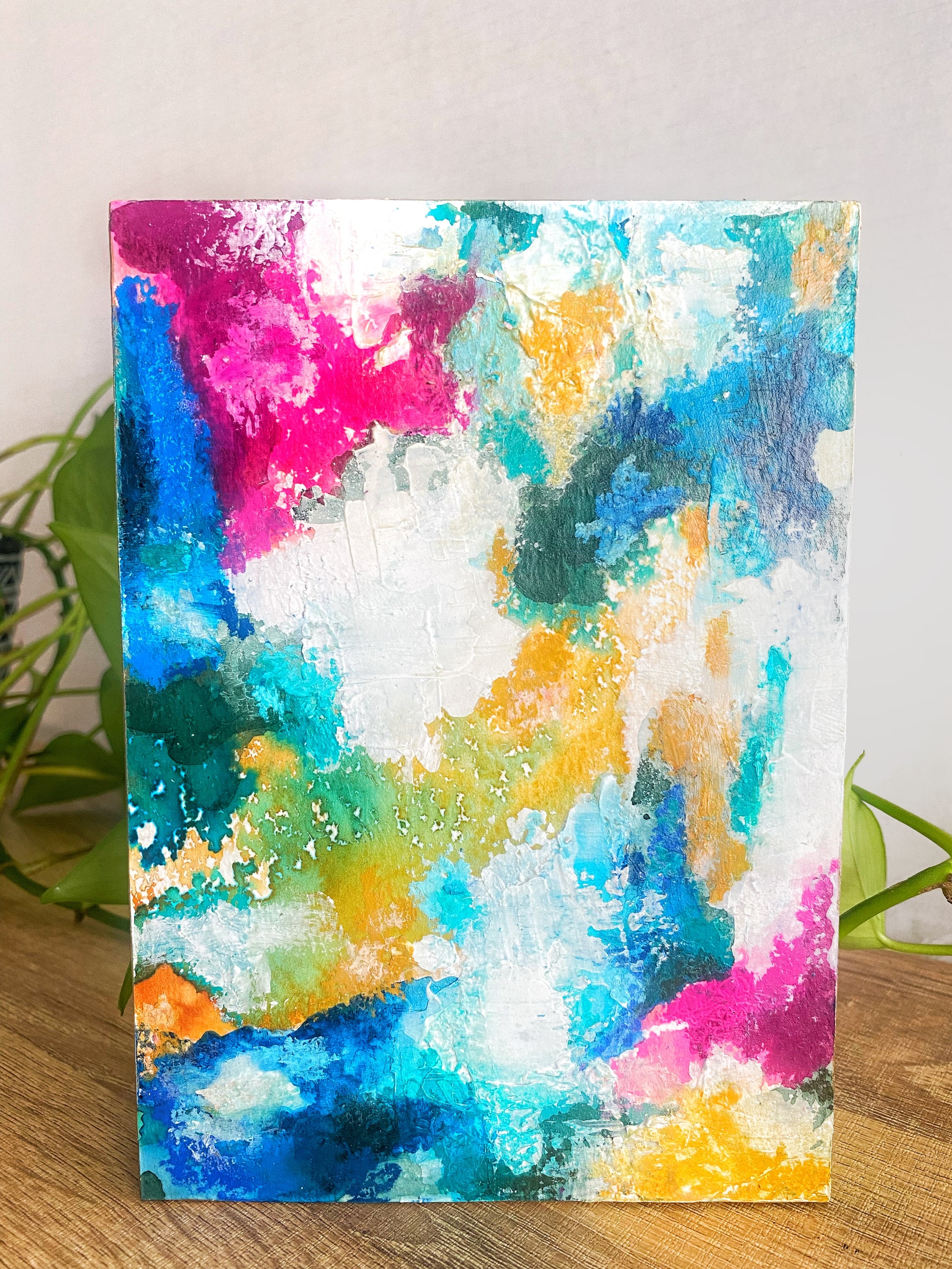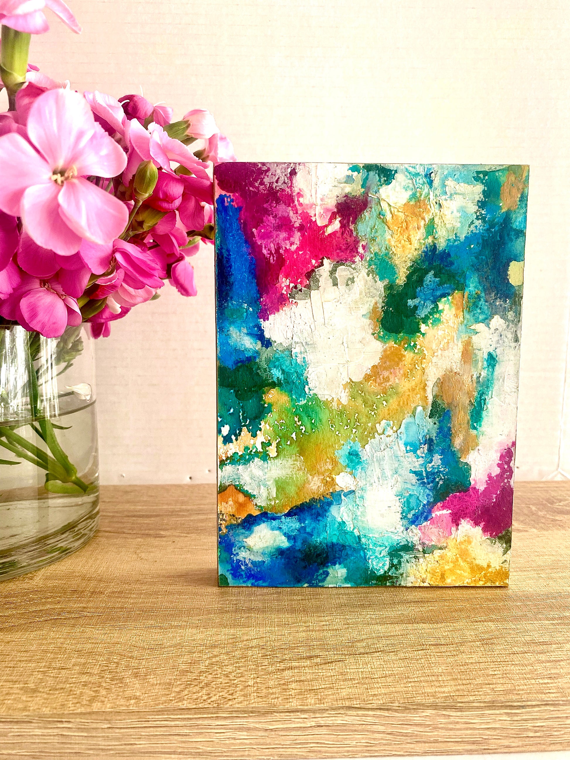 These 5x7 pieces stand on their own, making them a perfect shelf sitter, or can be hung using the cradled wood frame. Some were created as a series of two, three or four, and can be set up that way or individually.