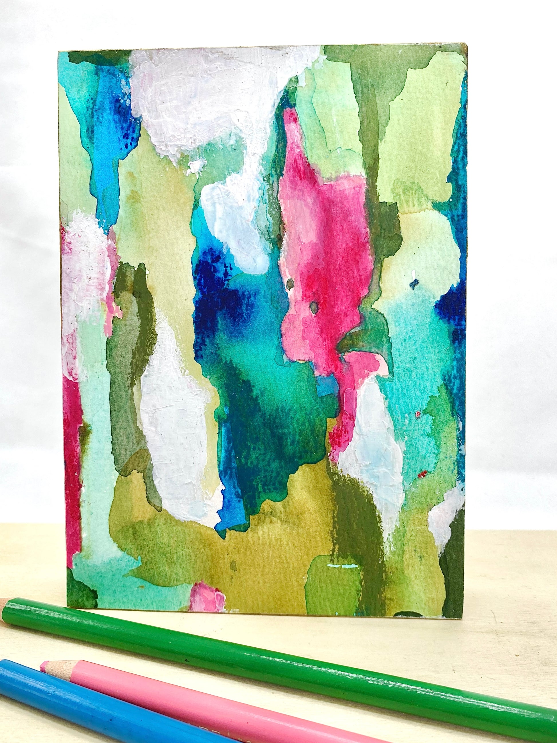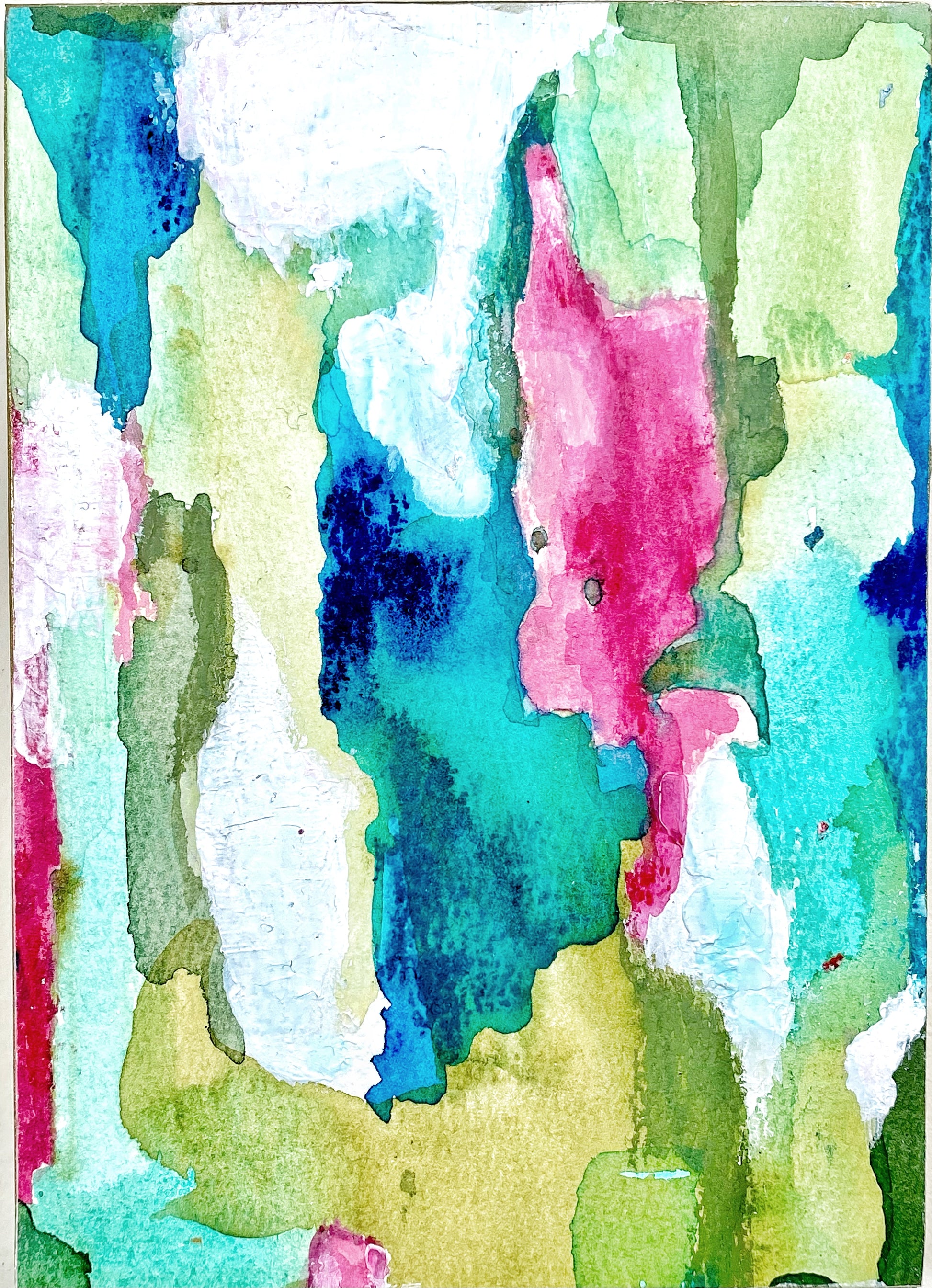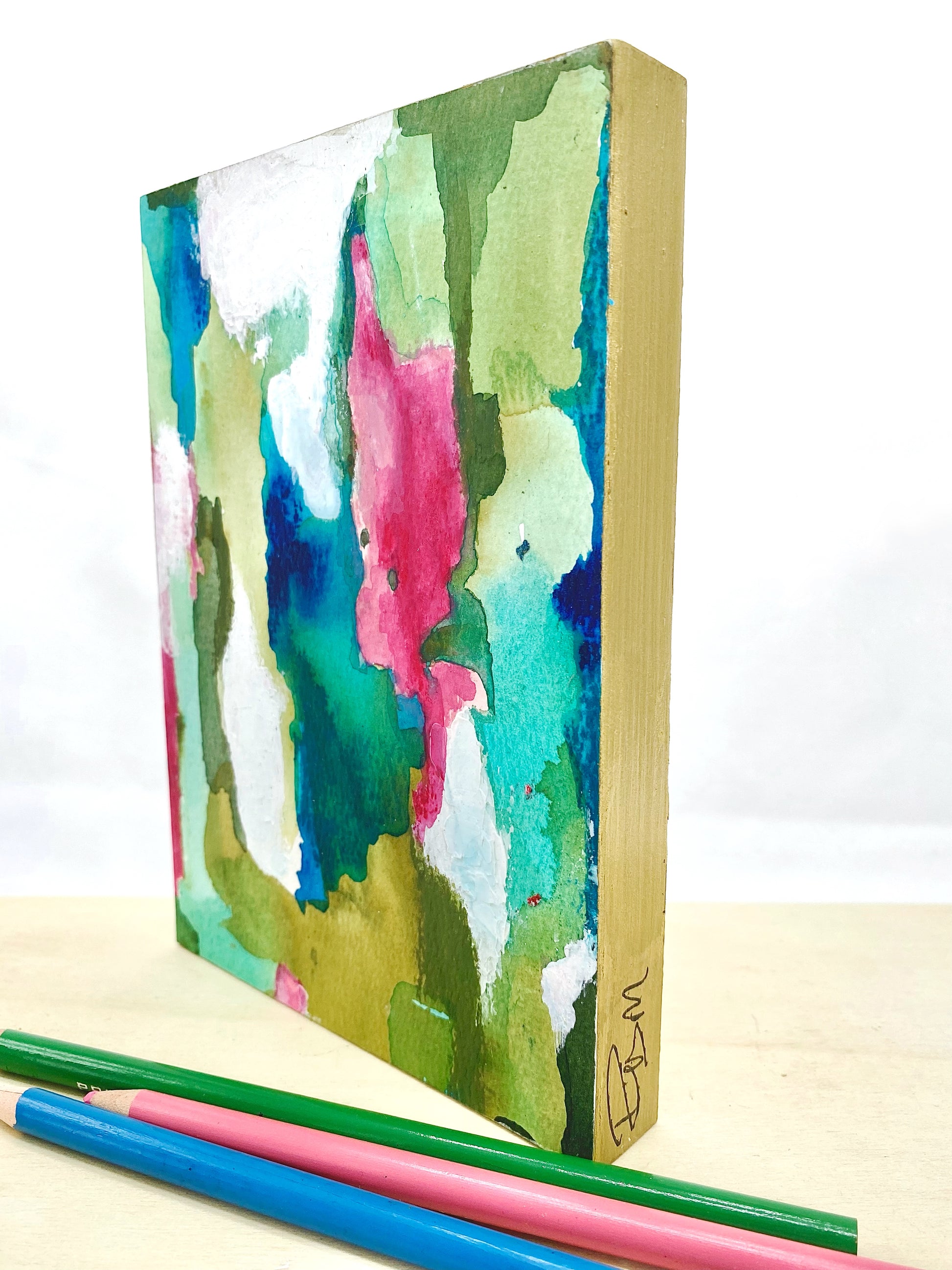My materials: Caran d’Ache Neocolor ll, concentrated watercolors, acrylic and alcohol ink, acrylic paint, and oil pastels, on 140 lb. cold pressed paper. Mounted on cradled wood panels with gilded muted gold edges. Signed with initials on the side panel and full signature on backs. The finish on these is textural and can look either matte or satin, using archival methods, with the final layer being burnished cold wax.