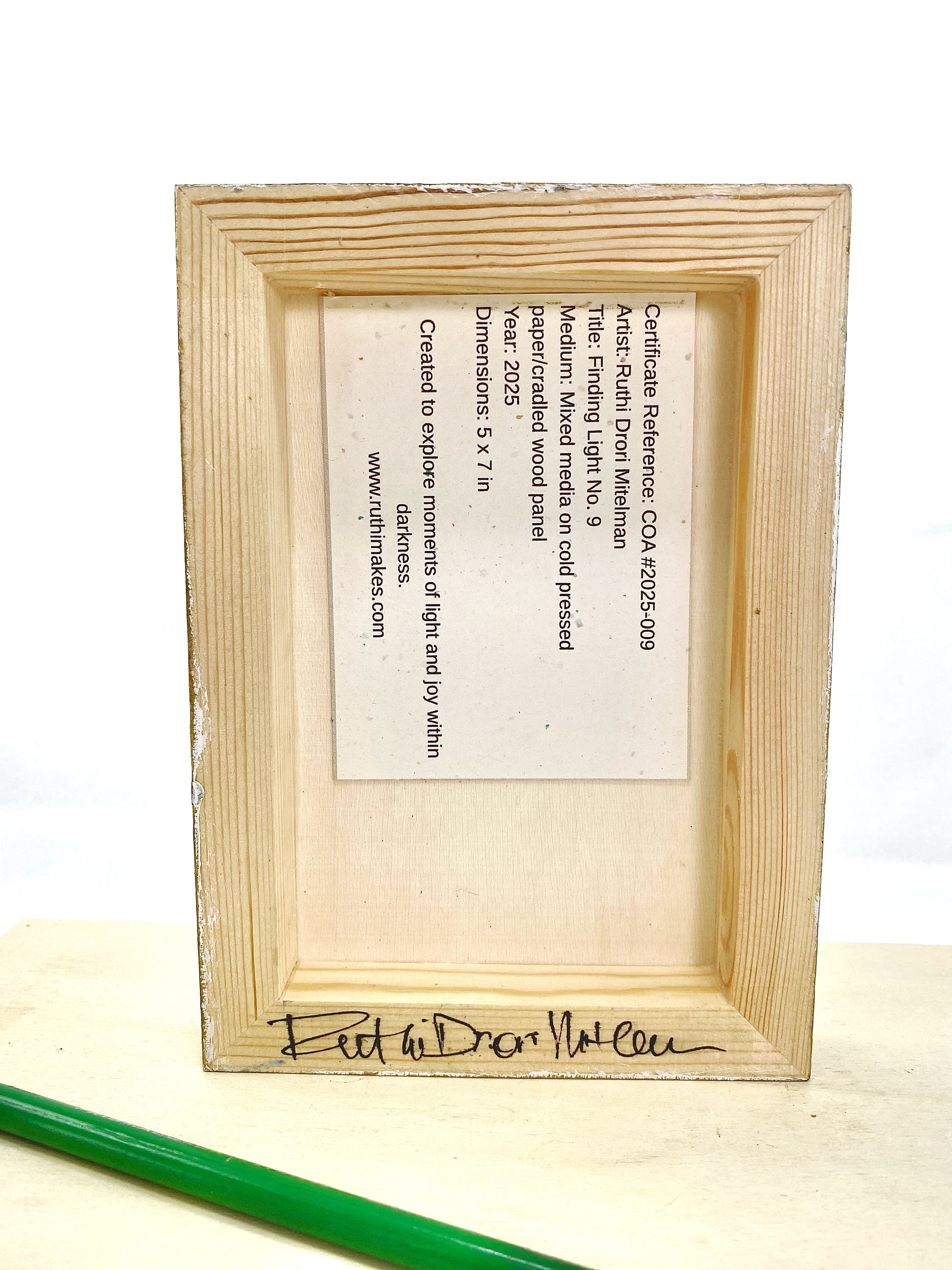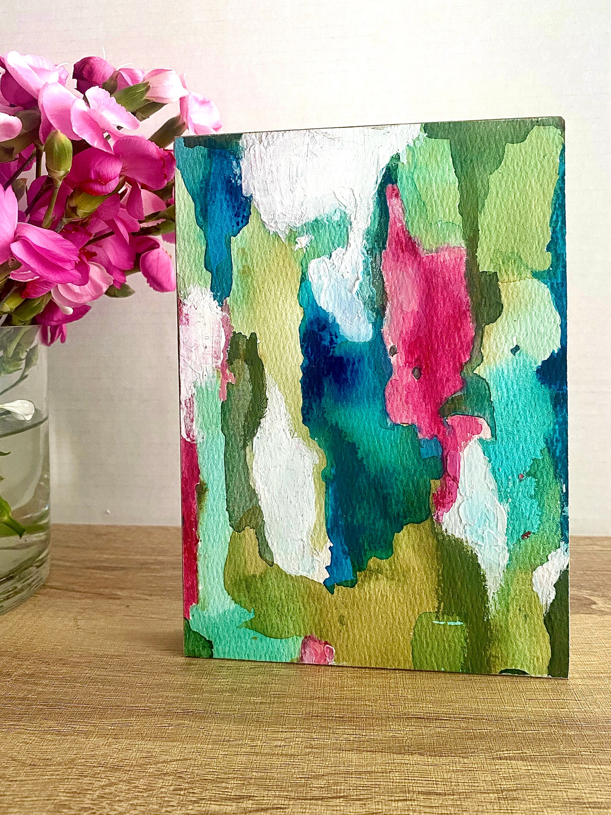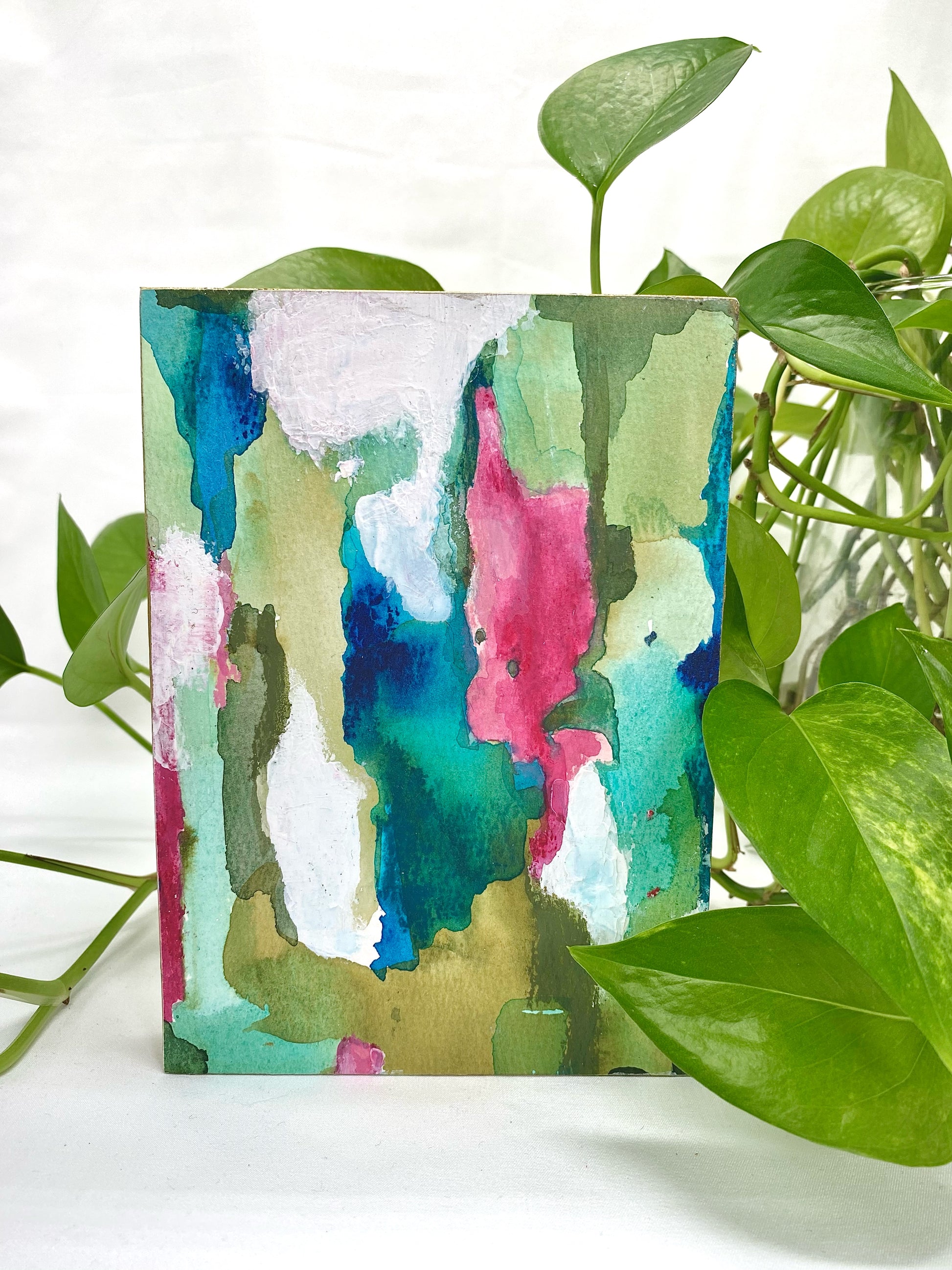 These 5x7 pieces stand on their own, making them a perfect shelf sitter, or can be hung using the cradled wood frame. Some were created as a series of two, three or four, and can be set up that way or individually.