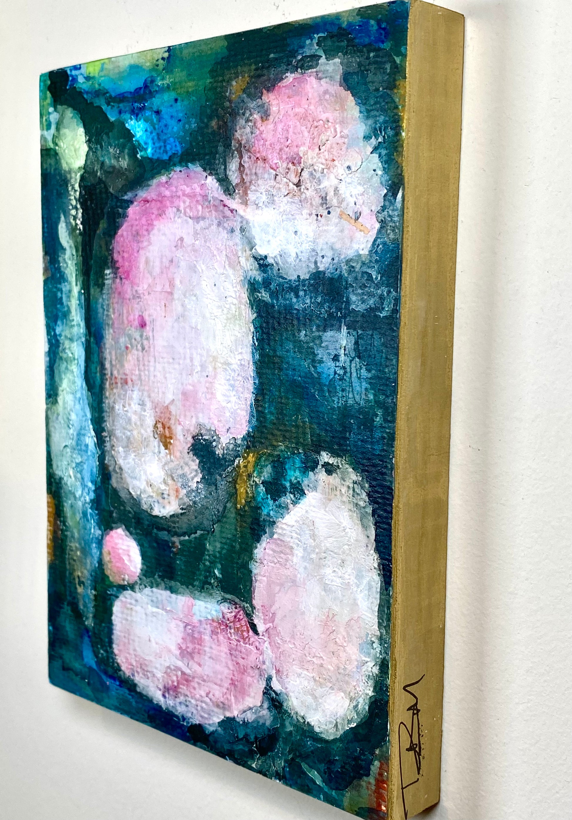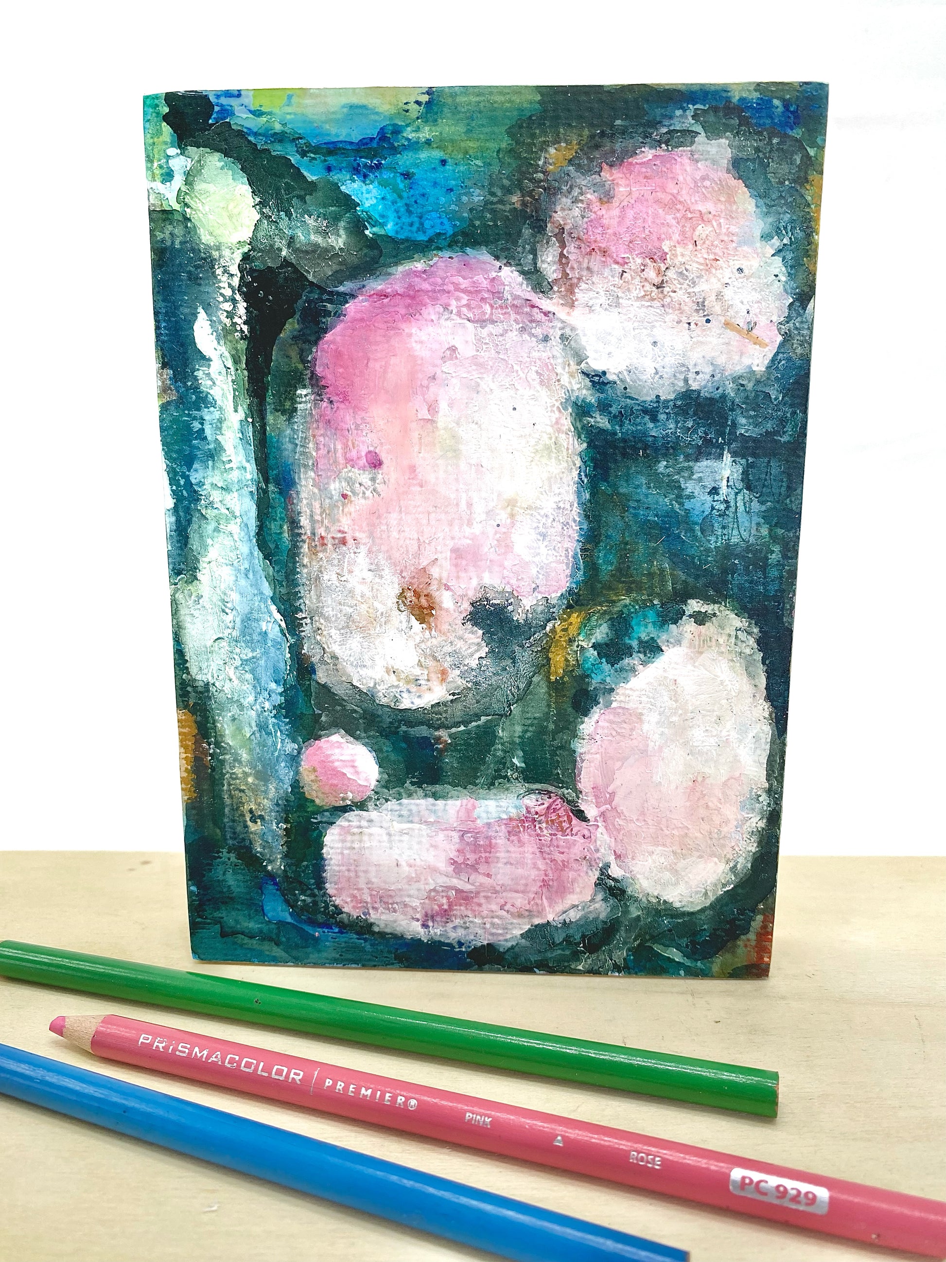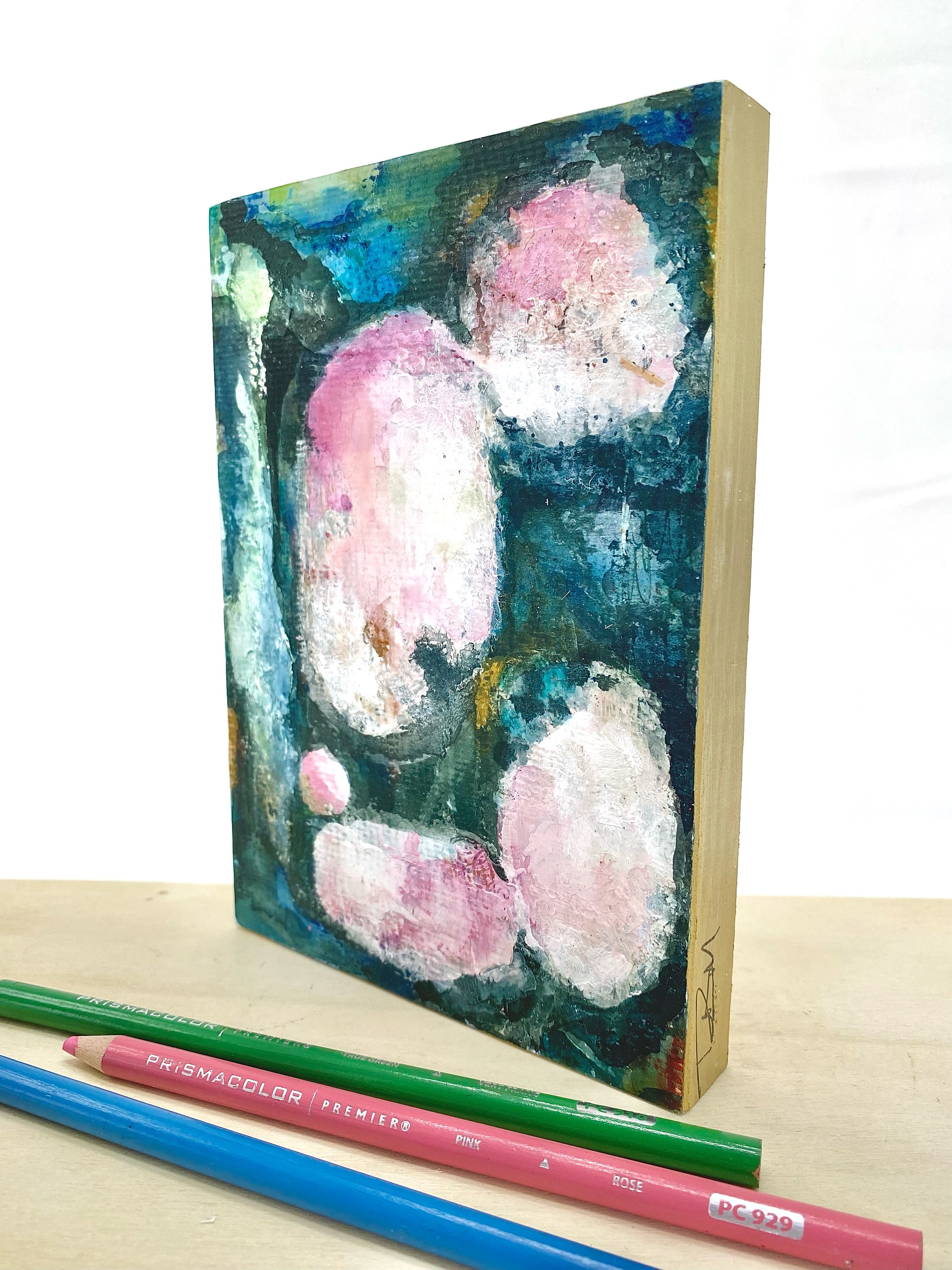 My materials: Caran d’Ache Neocolor ll, concentrated watercolors, acrylic and alcohol ink, acrylic paint, and oil pastels, on 140 lb. cold pressed paper. Mounted on cradled wood panels with gilded muted gold edges. Signed with initials on the side panel and full signature on backs. The finish on these is textural and can look either matte or satin, using archival methods, with the final layer being burnished cold wax.