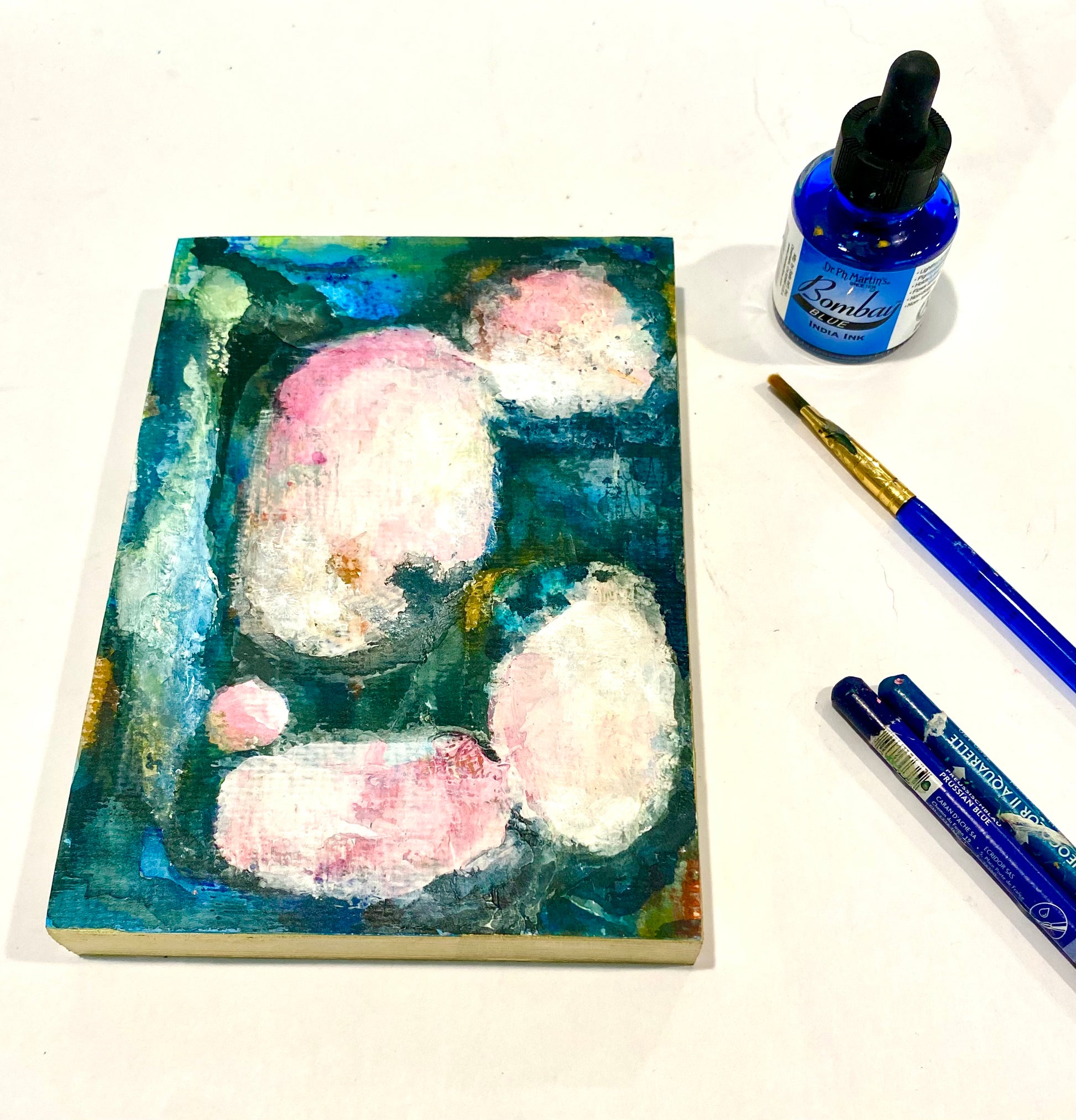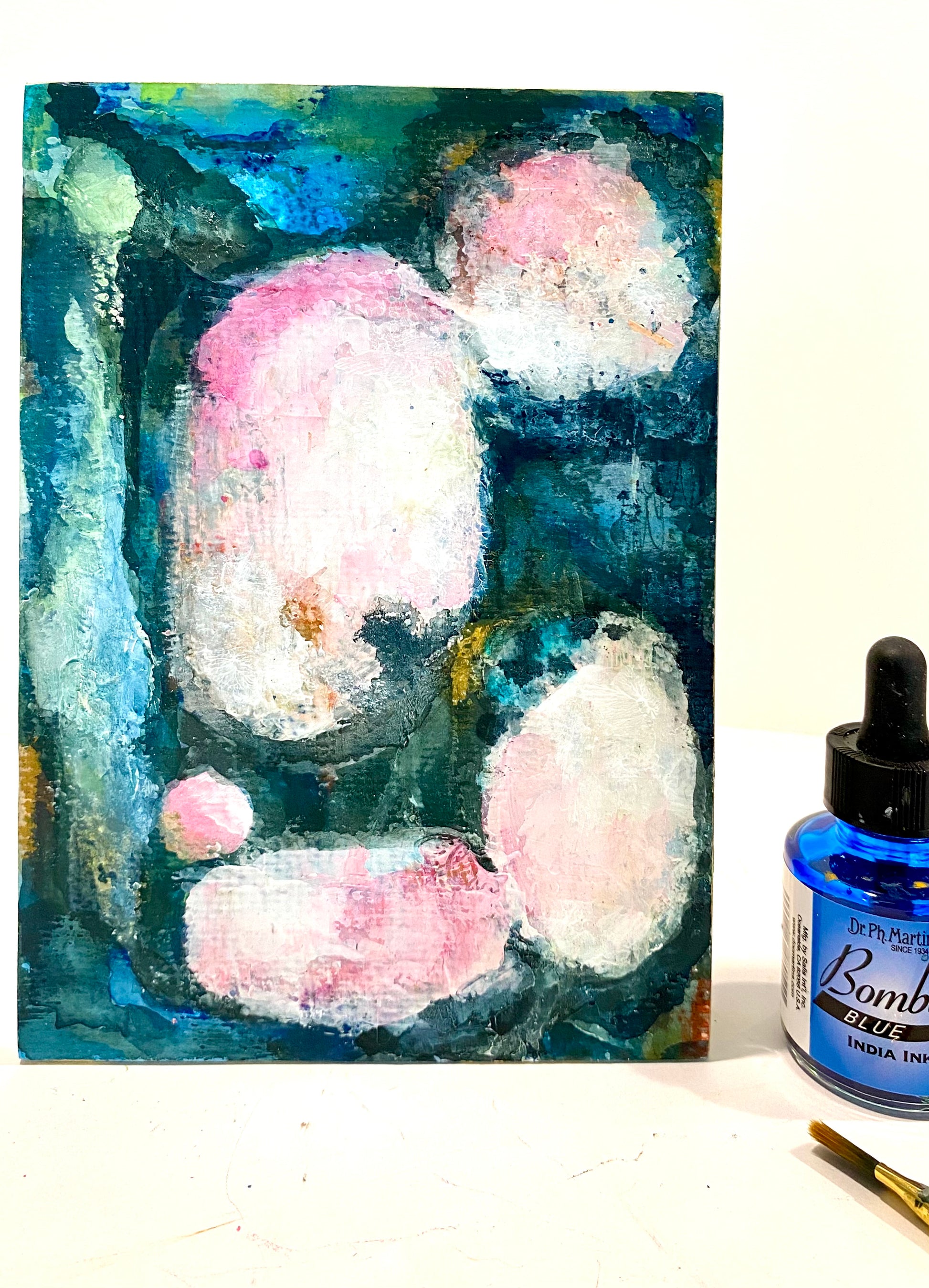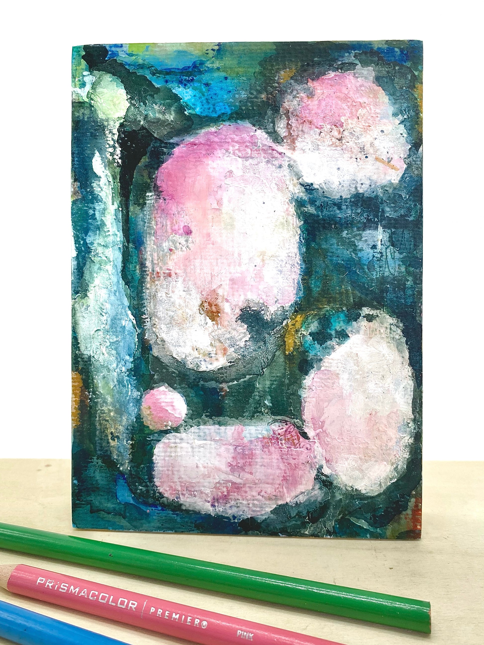 My materials: Caran d’Ache Neocolor ll, concentrated watercolors, acrylic and alcohol ink, acrylic paint, and oil pastels, on 140 lb. cold pressed paper. Mounted on cradled wood panels with gilded muted gold edges. Signed with initials on the side panel and full signature on backs. The finish on these is textural and can look either matte or satin, using archival methods, with the final layer being burnished cold wax.